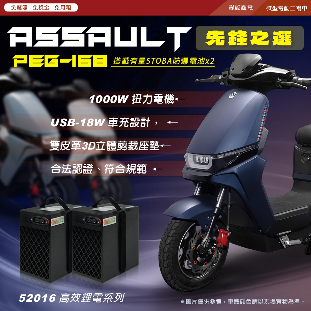 (車架)商品規格:車 型:Assault PEG-168車廠型號:展益(美家園) JY-168E車身尺寸:170*70*110cm坐墊高度:73CM輪胎尺寸:3.00-10電池型式:鋰電池/台灣製造(工研院防爆專利配方)電池規格:48V16Ah使用電壓:110v-120v充電時間:3-4小時煞車系統:雙碟煞安全煞車裝置控制系統:無刷輪轂馬達馬達功率:1000W欠壓保護:有最高時速:不超過25km/h續航里程:約35~40km爬坡能力:約10%安全載重量:100kg定速巡航:有前/後方向燈:前有/後有備 註:續航力會隨著各種因素而變化,例如騎乘重量、坡度、路面情況等等,另外正常情況下電池會逐漸老化,也會影響續航力。(電池)商品規格電池類型:鋰電池(工研院防爆專利配方)BSMI證書號碼:CI458061760026號99識別號碼:R45176電池容量:16AH電池電壓:48V保固時間:2年保固(限本賣場)電池產地:台灣(有量科技製造)註1. 最高續航力為實驗室測試值,模擬55Kg載重於定速25Km下的最高行駛距離,實際續航力因載重條件、個人騎乘習慣、騎乘路況與天候狀況不同而有所差異。註2. 充電時間是電池從零電量至充飽電的耗時,實際充電時間視當時殘餘電力與充電功率大小而定。本商品標準配備:車體 X1保卡及說明書 X1鋰電池x1充電器X1後照鏡X1(組)產品名稱:電動(輔助)自行車用二次鋰電池組Type(型號):ASP-52016Nominal Voltage(額定電壓):48VDCTypical Capacity(額定容量):16AhMax. Current(最大電流):30ACharging(充電):請使用指定的充電器CNS電池名稱:14CNi-Mn-CoP10/99/131製造年份/號碼:依電池上序號顯示製造者:有量科技股份有限公司地址:桃園市龜山區茶專路6號Caution注意:請勿任意丟棄並做好回收處理。請勿置入水中、勿靠近火源與勿自行維修拆解。請勿將電池短路、擠壓、落摔及穿刺。非使用說明書指定機器請勿使用。請勿自行將電池串、並聯使用。騎乘後請立即對電池組進行充電。