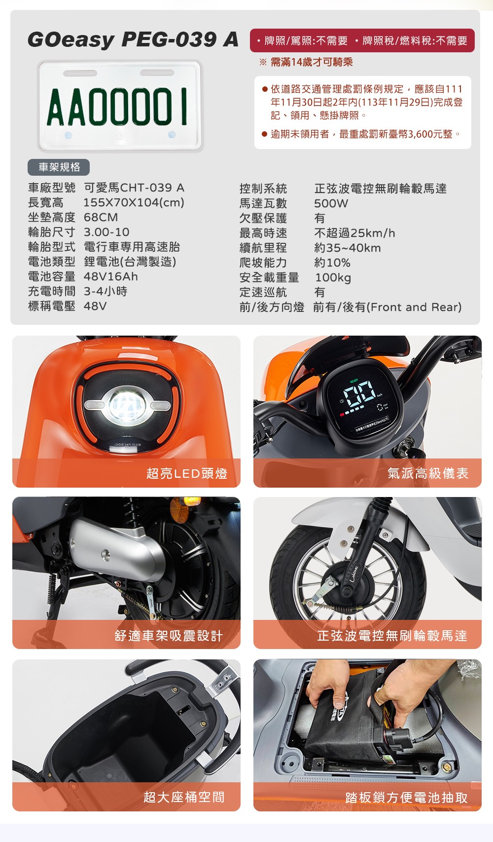 (車架)商品規格:車 型:GOeasy PEG-039 A車廠型號:可愛馬 CHT039 A車身尺寸:155×70×104cm坐墊高度:68CM輪胎尺寸:3.00-10電池型式:鋰電池/台灣製造(工研院防爆專利配方)電池規格:48V16Ah使用電壓:110v-120v充電時間:3-4小時煞車系統:鼓剎系統及煞車斷電安全裝置控制系統:智慧變頻電控無刷輪轂馬達馬達功率:500W欠壓保護:有最高時速:不超過25km/h續航里程:約35~40km爬坡能力:約10%安全載重量:100kg定速巡航:有前/後方向燈:前有/後有備 註:續航力會隨著各種因素而變化,例如騎乘重量、坡度、路面情況等等,另外正常情況下電池會逐漸老化,也會影響續航力。(電池)商品規格電池類型:鋰電池(工研院防爆專利配方)BSMI證書號碼:CI458061760026號99識別號碼:R45176電池容量:16AH電池電壓:48V保固時間:2年保固(限本賣場)電池產地:台灣(有量科技製造)註1. 最高續航力為實驗室測試值,模擬55Kg載重於定速25Km下的最高行駛距離,實際續航力因載重條件、個人騎乘習慣、騎乘路況與天候狀況不同而有所差異。註2. 充電時間是電池從零電量至充飽電的耗時,實際充電時間視當時殘餘電力與充電功率大小而定。本商品標準配備:車體 X1保卡及說明書 X1鋰電池x1充電器X1後視鏡X1(組)產品名稱:電動(輔助)自行車用二次鋰電池組Type(型號):ASP-52016Nominal Voltage(額定電壓):48VDCTypical Capacity(額定容量):16AhMax. Current(最大電流):30ACharging(充電):請使用指定的充電器CNS電池名稱:14CNi-Mn-CoP10/99/131製造年份/號碼:依電池上序號顯示製造者:有量科技股份有限公司地址:桃園市龜山區茶專路6號Caution注意:請勿任意丟棄並做好回收處理。請勿置入水中、勿靠近火源與勿自行維修拆解。請勿將電池短路、擠壓、落摔及穿刺。非使用說明書指定機器請勿使用。請勿自行將電池串、並聯使用。