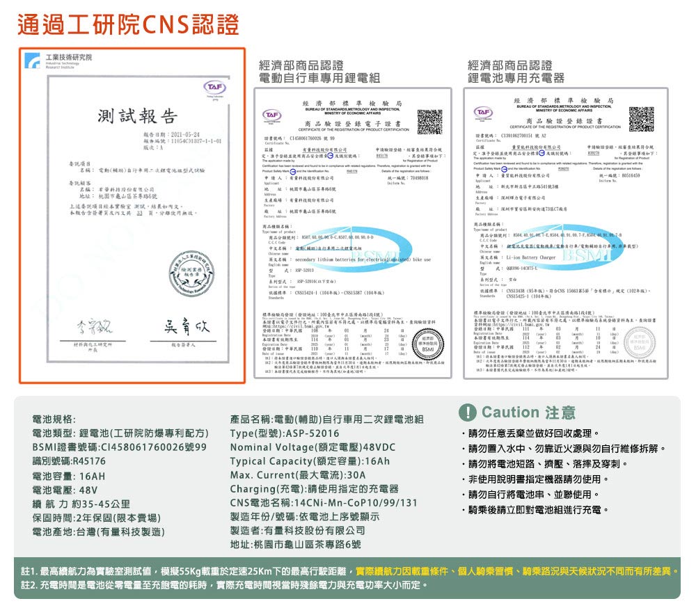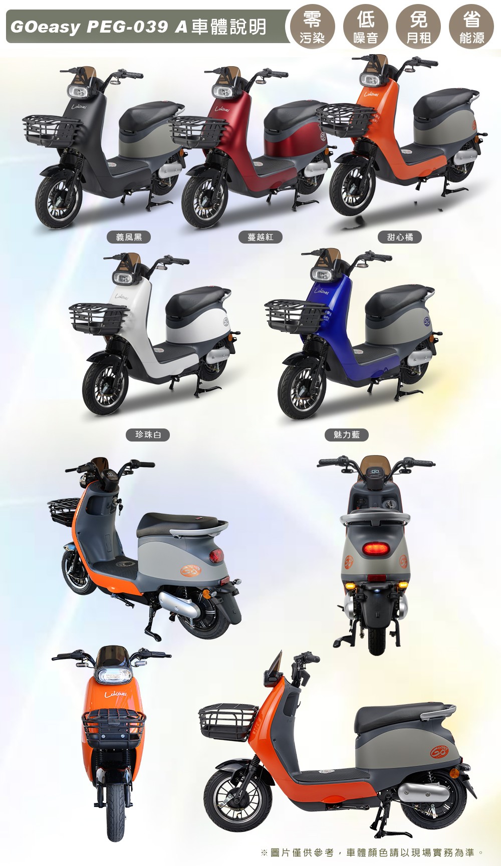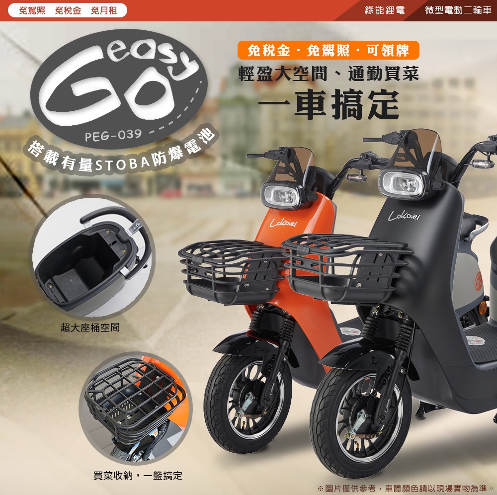 (車架)商品規格:車 型:GOeasy PEG-039 A車廠型號:可愛馬 CHT039 A車身尺寸:155×70×104cm坐墊高度:68CM輪胎尺寸:3.00-10電池型式:鋰電池/台灣製造(工研院防爆專利配方)電池規格:48V16Ah使用電壓:110v-120v充電時間:3-4小時煞車系統:鼓剎系統及煞車斷電安全裝置控制系統:智慧變頻電控無刷輪轂馬達馬達功率:500W欠壓保護:有最高時速:不超過25km/h續航里程:約35~40km爬坡能力:約10%安全載重量:100kg定速巡航:有前/後方向燈:前有/後有備 註:續航力會隨著各種因素而變化,例如騎乘重量、坡度、路面情況等等,另外正常情況下電池會逐漸老化,也會影響續航力。(電池)商品規格電池類型:鋰電池(工研院防爆專利配方)BSMI證書號碼:CI458061760026號99識別號碼:R45176電池容量:16AH電池電壓:48V保固時間:2年保固(限本賣場)電池產地:台灣(有量科技製造)註1. 最高續航力為實驗室測試值,模擬55Kg載重於定速25Km下的最高行駛距離,實際續航力因載重條件、個人騎乘習慣、騎乘路況與天候狀況不同而有所差異。註2. 充電時間是電池從零電量至充飽電的耗時,實際充電時間視當時殘餘電力與充電功率大小而定。本商品標準配備:車體 X1保卡及說明書 X1鋰電池x1充電器X1後視鏡X1(組)產品名稱:電動(輔助)自行車用二次鋰電池組Type(型號):ASP-52016Nominal Voltage(額定電壓):48VDCTypical Capacity(額定容量):16AhMax. Current(最大電流):30ACharging(充電):請使用指定的充電器CNS電池名稱:14CNi-Mn-CoP10/99/131製造年份/號碼:依電池上序號顯示製造者:有量科技股份有限公司地址:桃園市龜山區茶專路6號Caution注意:請勿任意丟棄並做好回收處理。請勿置入水中、勿靠近火源與勿自行維修拆解。請勿將電池短路、擠壓、落摔及穿刺。非使用說明書指定機器請勿使用。請勿自行將電池串、並聯使用。