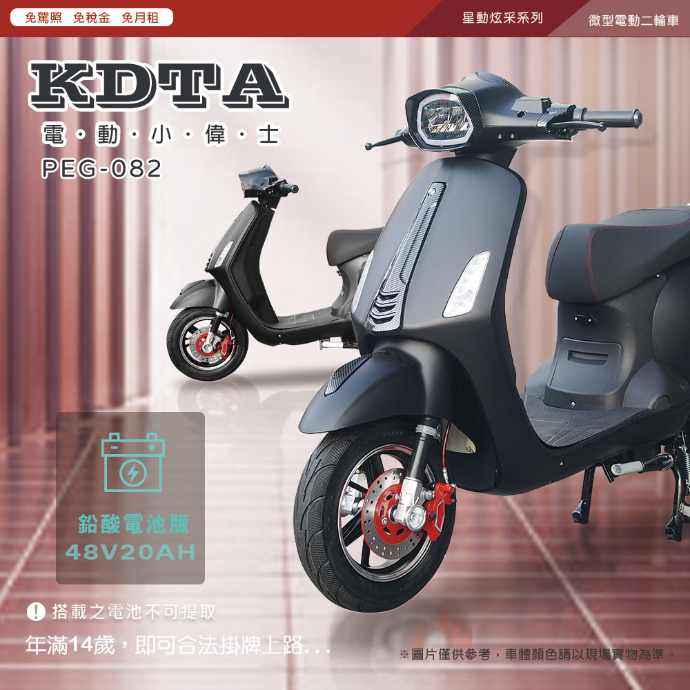 (車架)商品規格:車 型:Mini Hero PEG-082車廠型號:鑛達 小偉士車身尺寸: 168.8*70*109.7cm坐墊高度:69CM輪胎尺寸:3.00-10電池型式:鉛酸電池(不可提取)電池規格:48V20Ah(6個月保固)使用電壓:110v-120v充電時間:6-8小時煞車系統:前後碟剎系統及煞車斷電安全裝置控制系統:正弦波電控無刷輪轂馬達馬達功率:983.49W欠壓保護:有最高時速:不超過25km/h續航里程:約35~40km爬坡能力:約10%安全載重量:100kg定速巡航:有前/後方向燈:前有/後有備 註:續航力會隨著各種因素而變化,例如騎乘重量、坡度、路面情況等等,另外正常情況下電池會逐漸老化,也會影響續航力。(電池)商品規格:電池類型: 鉛酸電池(無法提取)識別號碼:R65387電池容量: 48V20AH電池電壓: 48V保固時間:6個月保固註1. 最高續航力為實驗室測試值,模擬55Kg載重於定速25Km下的最高行駛距離,實際續航力因載重條件、個人騎乘習慣、騎乘路況與天候狀況不同而有所差異。註2. 充電時間是電池從零電量至充飽電的耗時,實際充電時間視當時殘餘電力與充電功率大小而定。本商品標準配備:車體 X1保卡及說明書 X1鉛酸電池x1充電器X1後視鏡X1(組)Caution注意:請勿任意丟棄並做好回收處理。請勿置入水中、勿靠近火源與勿自行維修拆解。請勿將電池短路、擠壓、落摔及穿刺。非使用說明書指定機器請勿使用。請勿自行將電池串、並聯使用。騎乘後請立即對電池組進行充電。1年保固期保固內容:以本車所提供之品質保證書內容條款詳述,鉛酸電池保固半年(只限本賣場),車架、電機馬達、電子控制器、充電器、保固一年, 各項開關按鈕、轉把、喇叭、DC轉換器保固三個月,外殼塑件、燈泡、車胎、剎車皮屬消耗品無提供保固。 保固適用地區:台灣本島所使用之本公司電動自行車。
