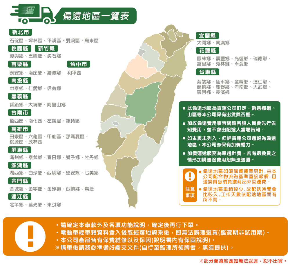 (車架)商品規格:車 型:Mini Hero PEG-082車廠型號:鑛達 小偉士車身尺寸: 168.8*70*109.7cm坐墊高度:69CM輪胎尺寸:3.00-10電池型式:鉛酸電池(不可提取)電池規格:48V20Ah(6個月保固)使用電壓:110v-120v充電時間:6-8小時煞車系統:前後碟剎系統及煞車斷電安全裝置控制系統:正弦波電控無刷輪轂馬達馬達功率:983.49W欠壓保護:有最高時速:不超過25km/h續航里程:約35~40km爬坡能力:約10%安全載重量:100kg定速巡航:有前/後方向燈:前有/後有備 註:續航力會隨著各種因素而變化,例如騎乘重量、坡度、路面情況等等,另外正常情況下電池會逐漸老化,也會影響續航力。(電池)商品規格:電池類型: 鉛酸電池(無法提取)識別號碼:R65387電池容量: 48V20AH電池電壓: 48V保固時間:6個月保固註1. 最高續航力為實驗室測試值,模擬55Kg載重於定速25Km下的最高行駛距離,實際續航力因載重條件、個人騎乘習慣、騎乘路況與天候狀況不同而有所差異。註2. 充電時間是電池從零電量至充飽電的耗時,實際充電時間視當時殘餘電力與充電功率大小而定。本商品標準配備:車體 X1保卡及說明書 X1鉛酸電池x1充電器X1後視鏡X1(組)Caution注意:請勿任意丟棄並做好回收處理。請勿置入水中、勿靠近火源與勿自行維修拆解。請勿將電池短路、擠壓、落摔及穿刺。非使用說明書指定機器請勿使用。請勿自行將電池串、並聯使用。騎乘後請立即對電池組進行充電。1年保固期保固內容:以本車所提供之品質保證書內容條款詳述,鉛酸電池保固半年(只限本賣場),車架、電機馬達、電子控制器、充電器、保固一年, 各項開關按鈕、轉把、喇叭、DC轉換器保固三個月,外殼塑件、燈泡、車胎、剎車皮屬消耗品無提供保固。 保固適用地區:台灣本島所使用之本公司電動自行車。