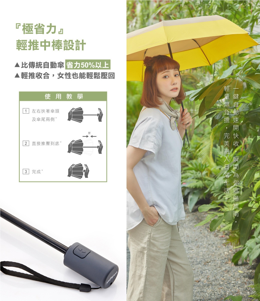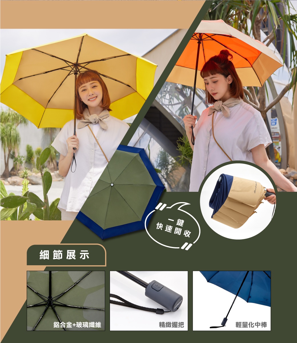 【周周生活】雨傘 現貨 自動傘 傘 折疊傘 遮陽傘 陽傘 防潑水 瞬收傘 摺疊傘 折疊雨傘 自動 晴雨傘 快速出貨品名:大振豐 Unispin任性不羈自動完美瞬收傘全新第二代專利貼片,打造瞬間即完美擺脫參差不齊,滿足收納偏執狂對細節的追求特色說明:1.獨家專利記憶傘布,三秒完美瞬收2.超潑水一甩即乾,滿足晴雨兩用3.一鍵自動開收,一氣呵成乾淨俐落4.鋁合金+玻纖傘骨,輕盈堅固又抗風5.撞色拼接解放渴望,展現任性不羈的狂野內心【重量】350g【收納尺寸】29x5x5cm【傘布】聚脂纖維【傘面弧度半徑】58cm【傘面張開直徑】97cm【傘骨數量】7支【骨架材質】玻璃纖維門市資訊:周周生活地址: 高雄市苓雅區建國一路39號電話: 07-7903060FB粉絲專頁:周周生活 雨衣雨具 洋傘 毛巾專賣店#周周生活 #雨傘 #現貨 #自動傘 #傘 #折疊傘 #遮陽傘 #陽傘 #瞬收傘 #摺疊傘 #折疊雨傘 #晴雨傘 #自動雨傘 #快速出貨