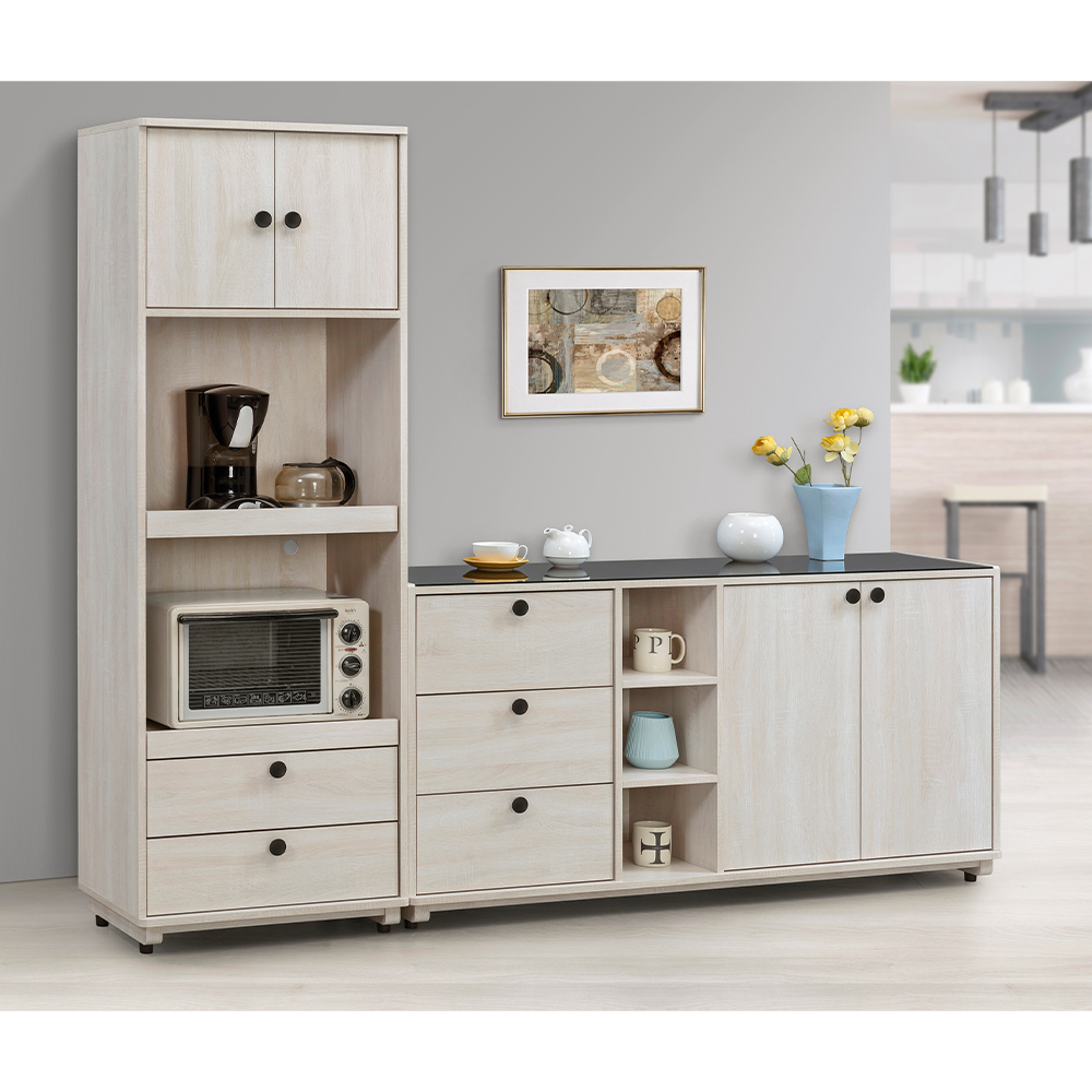 多樣化收納空間:黑色強化玻璃檯面適合放置咖啡機或裝飾,營造用餐儀式感;三層抽屜可以將廚房用品或其他物品妥善分類收納;中間開放空間適合擺放餐具或是常用物品;右側櫃門可以放置較大家電或是需要隱藏的物品,三種收納形式,讓每一件物品都有專屬空間。