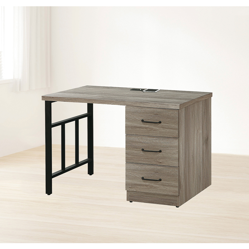 書桌設計:工業風混搭設計,木紋桌面搭配霧面黑金屬腳架,風格時尚且穩固耐用。桌面中央設有黑色USB兩用插座,方便充電。右側設有三層抽屜,提供充足的分類空間。多種風格選色:清新北歐感的橡木白、自然原木感的橡木色、沉穩內斂的灰橡色,都能完美融入不同的居家主題。