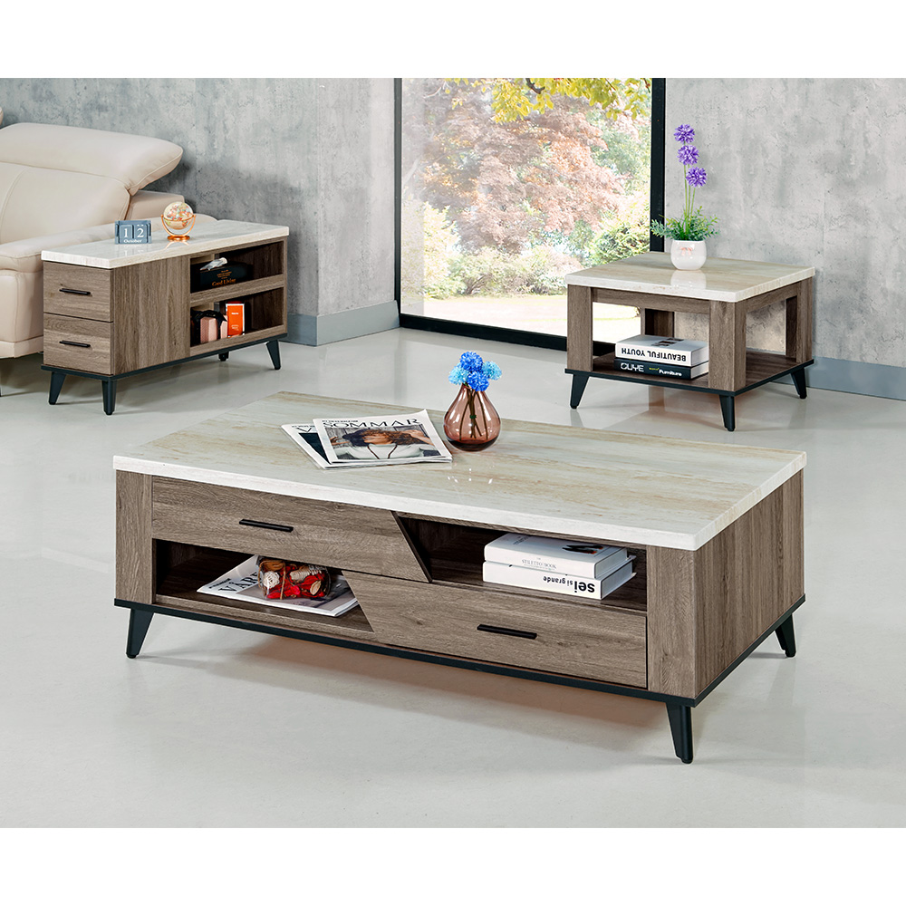 大茶几設計:仿大理石紋桌面與沉穩內斂的木紋再搭配俐落黑色高腳,色彩與材質上的碰撞,展示現代撞色美學,極具設計感。