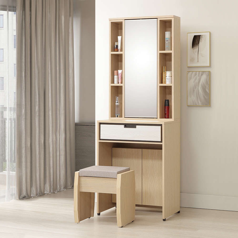 收納空間:化妝桌上座設有開放式層格及旋轉鏡面,可擺放日常用品並兼具防塵;下座配置了實用抽屜,適合存放化妝工具與飾品;化妝椅座墊可掀開,提供了額外的隱形收納空間,所有物品都能有專屬位置。