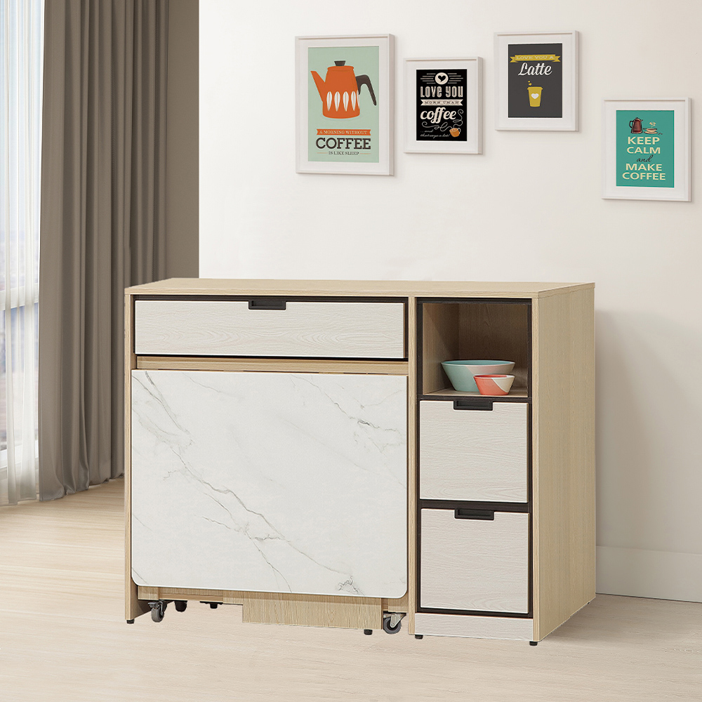 收合餐桌設計:主體以清新溫暖的原木色木紋,營造日系舒適感;折疊的桌面則以時尚的米白色仿大理石紋路,立刻提升了整體的輕奢質感。