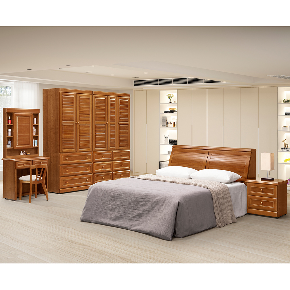 化妝台設計:暖調柚木色,色澤溫潤飽滿,營造沉穩的懷舊氛圍。頂部與桌緣帶有優雅的圓弧邊角處理,搭配復古造型的小圓把手,呈現復古韻味、歷久彌新的視覺感受感。