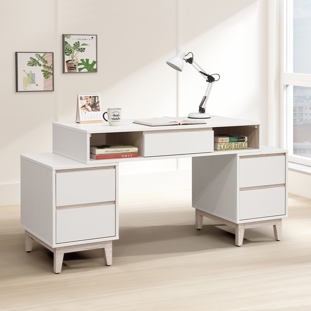 收納功能:兩側設計抽屜櫃,提供充足的容量歸類私人物品;利用結構高低差,創造雙邊開放式置物平台,隨手就能拿取最愛讀物;中央的隱藏式抽屜,能收納文具或重要文件,擁有桌面淨空感與專注力。