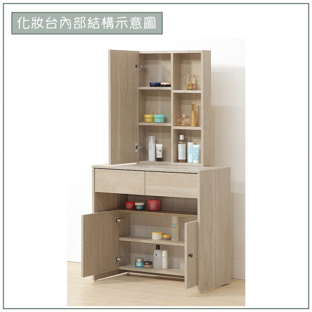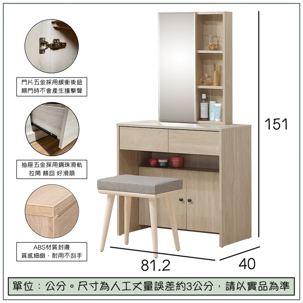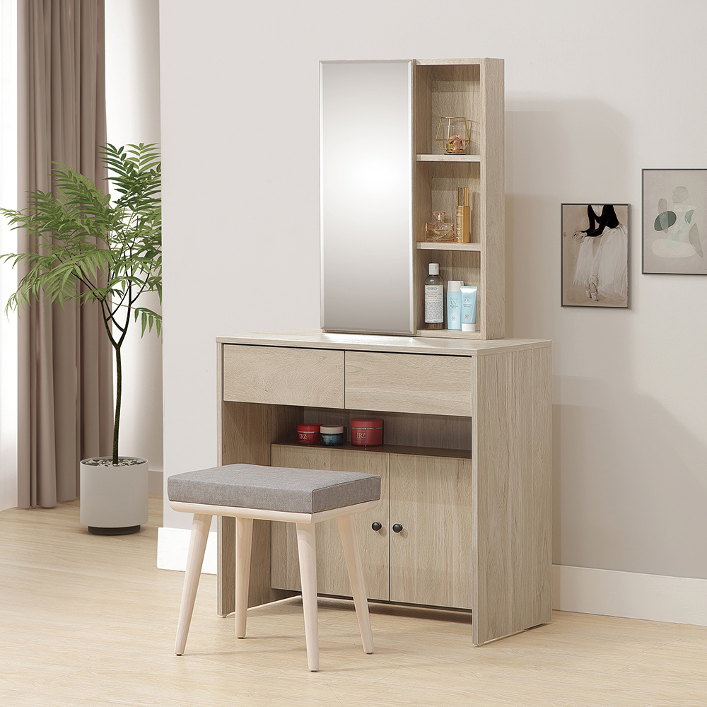 收納功能:鏡子後面藏了三層小空間,能收好不常用或易受潮的保養品;右側開放層架讓香水、乳液隨手就拿得到;雙抽屜可收納飾品和彩妝工具;抽屜下方隱藏儲物區是囤貨用品的最佳收納角落。每一次整理,都能感受到生活的小確幸。