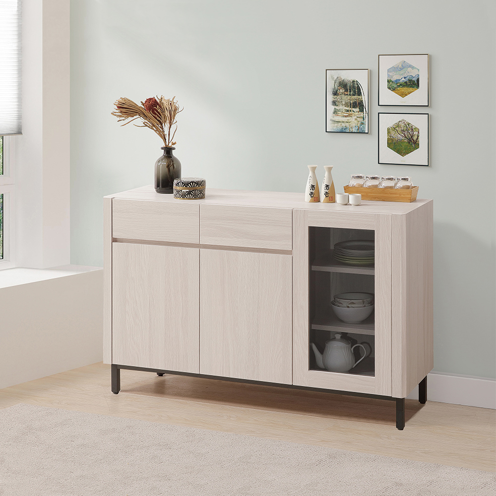 多樣化收納空間:寬敞的檯面可以放置餐點、咖啡機或裝飾品,營造用餐儀式感;玻璃門展示櫃可以展示精緻的餐具;左側的櫃門及抽屜,可以將廚房用品或其他物品妥善分類收納,讓空間更整潔。