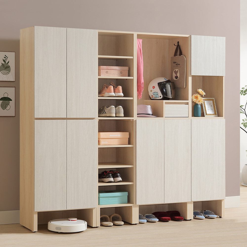 收納空間:頂部櫃門可放鞋盒或不常使用的物品;中間開放空間可擺放隨手方便拿取的用品;下方櫃門內部設有多層活動隔板,可以根據鞋子的高度自由調整。