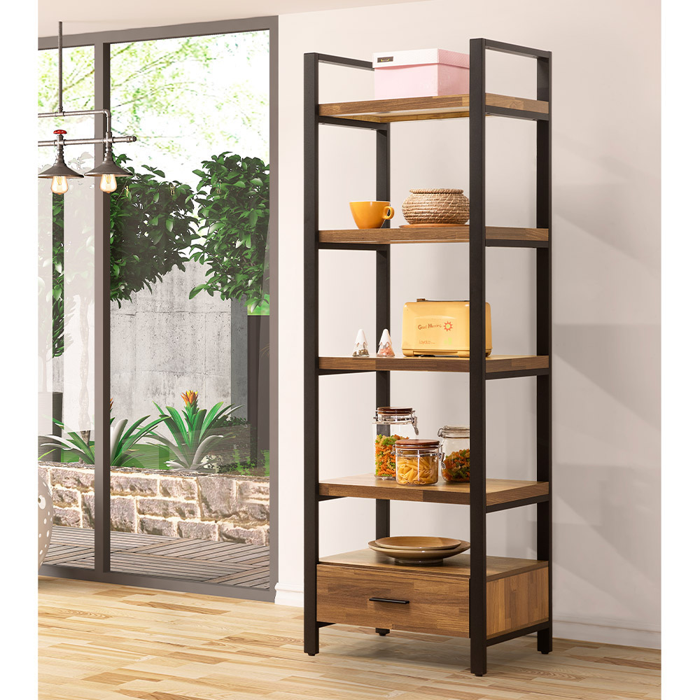 收納空間:窄版高挑的結構,有效利用牆面垂直空間;四層開放式層板適合擺放咖啡器具、餐具或書籍;底部抽屜可以存放私人物品或雜物,收納更有彈性。