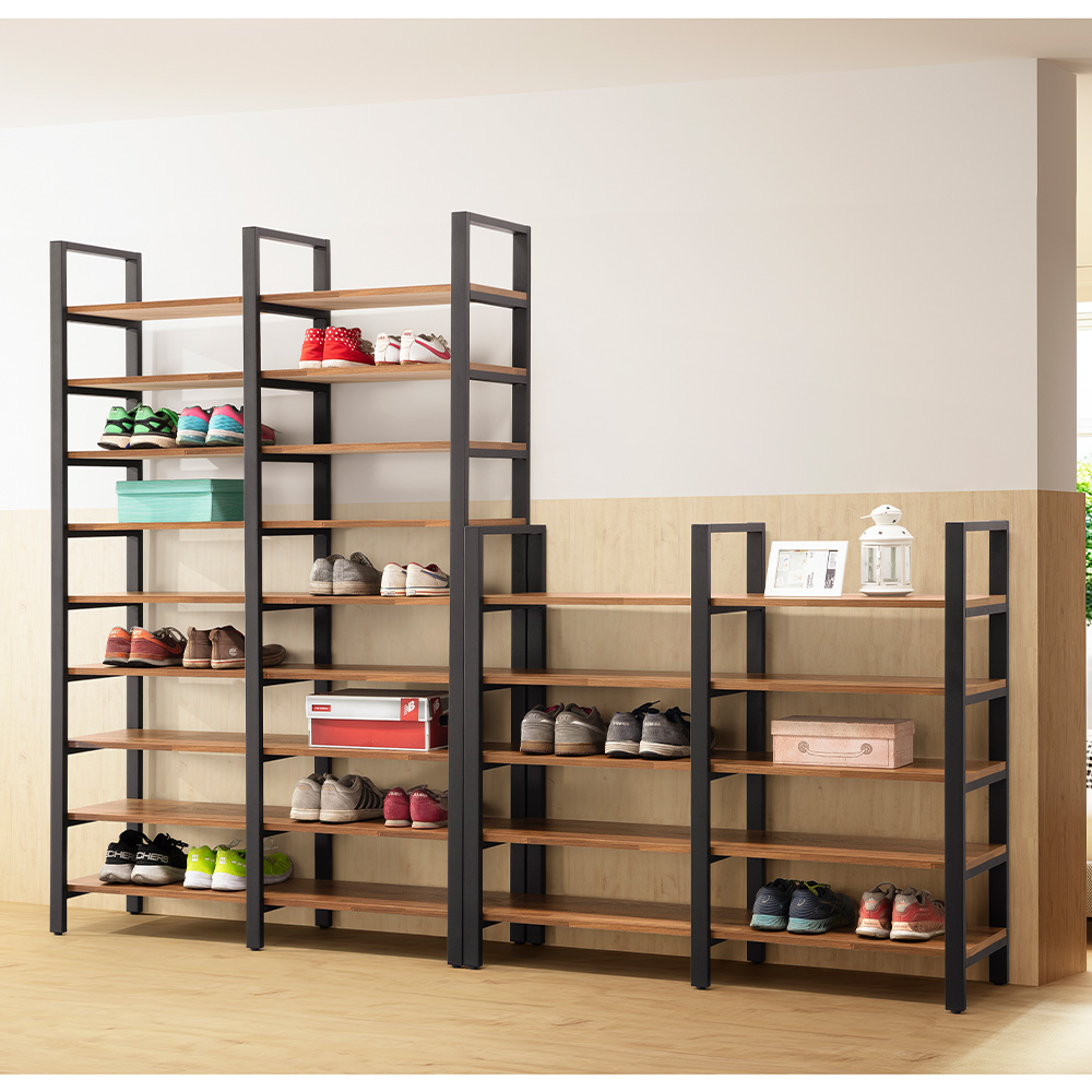 展示架設計:整體採用霧面黑色金屬鐵才構成主體框架,線條簡潔筆直,強調垂直向上延伸,賦予櫃體強烈的結構感及現代感;全開放式設計,視覺通透也便於鞋子通風散熱。搭配仿舊灰色木紋或復古柚木色,雙色選擇,隨心打造理想風格。