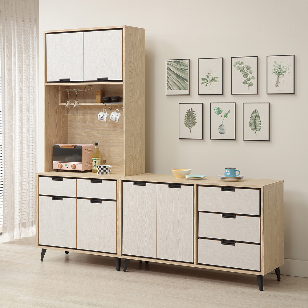收納空間:上層櫃門內適合存放不常使用的備品或電器;中間開放式層架可以展示常用的咖啡杯或調味料,另有貼心配備紅酒杯架及掛勾;檯面可作為備餐或電器工作區;下層提供兩個抽屜,方便分類收納零散餐具,櫃門則能穩妥收納鍋具與碗盤,完美滿足餐廚空間的多功能儲物需求。