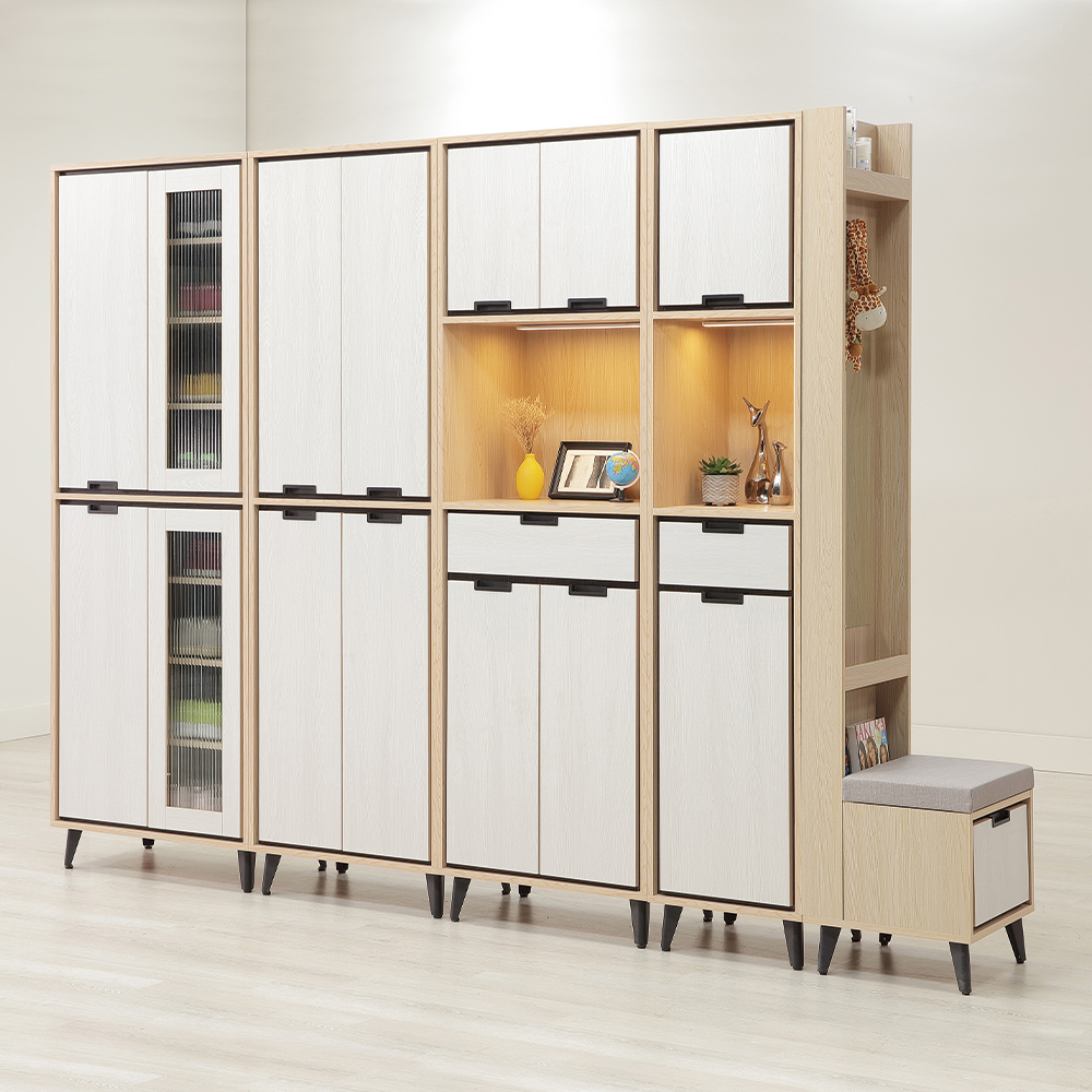 收納空間:鞋櫃使用封閉式門櫃與長虹玻璃櫃,能妥善收納全家人的鞋履、包包與生活備品也能達到防塵效果;中段的暖光展示層與多用途抽屜,將隱蔽收納與美感展示完美平衡;右側貼心整合了穿衣鏡、掛勾與具備儲物功能的穿鞋椅,讓更衣整裝一氣呵成。