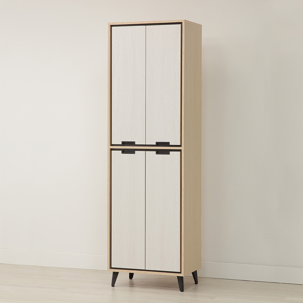 收納空間:上下兩組對稱的雙門大櫃,提供了隱藏空間,能夠將雜物、鞋履徹底收納,實現空間的極簡與整潔。上下分層的結構,方便使用者依物品性質或使用頻率進行分類管理。