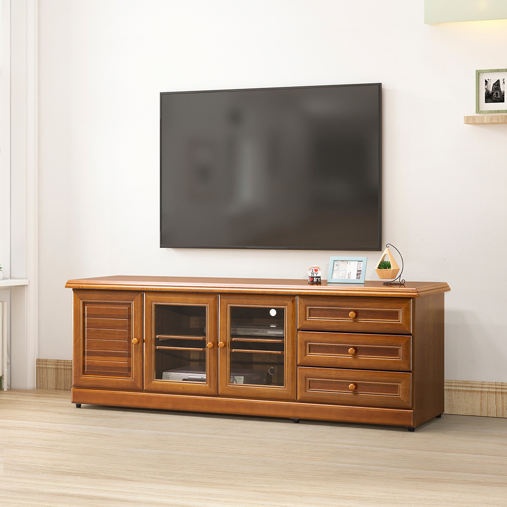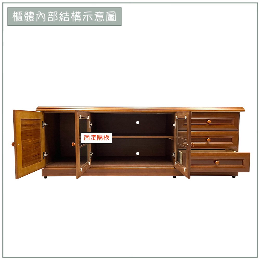收納功能:中央的雙開玻璃門內配有固定式層板,可放置影音設備或收藏品,背板設有兩個電線穿孔,解決雜亂線路的困擾;左側櫃門提供了大置物空間,適合存放雜誌或不常使用的物品;右側三層抽屜,能將日常瑣碎小物分類,讓客廳空間隨時保持清爽整潔。