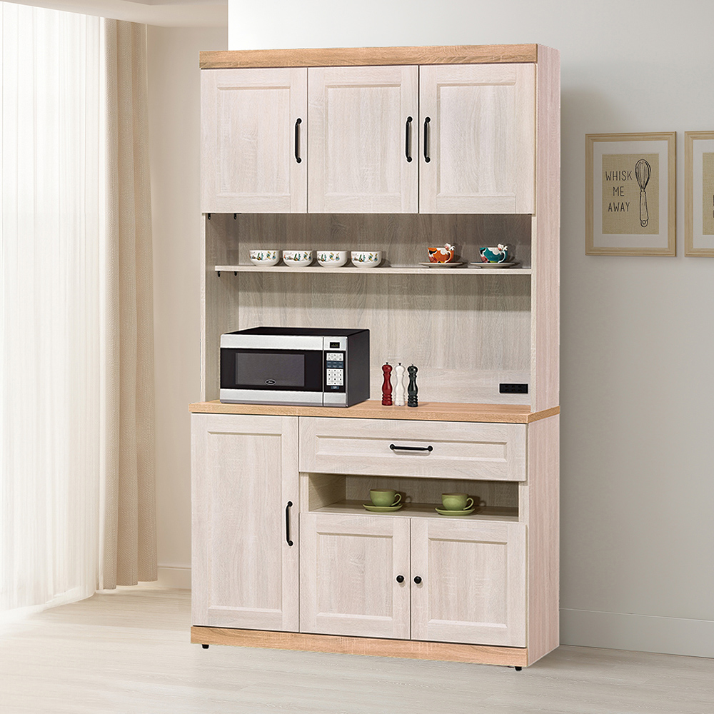 收納功能:餐櫃上座採用開門式儲物空間,能隱藏生活雜物;中央開放平台設置貼心插座,為電鍋與咖啡機打造專屬的機能工作區。下座空間規劃了抽屜,可以分類餐具或廚房用品;櫃門內配置可調式活動隔板,無論是碟盤或是大尺寸湯鍋,都能依據需求找到最合適的歸宿。