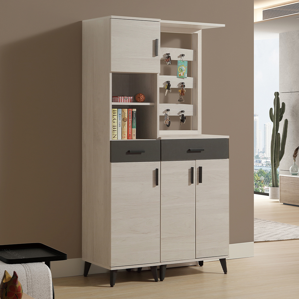 收納功能:櫃門內擁有多層儲物空間,層板可自由調整高度,適合收納鞋類或大型居家雜物;兩組獨立抽屜則可分類存放鑰匙、帳單等生活小物;掛勾背板與開放式格位,讓包包、帽子或鑰匙能隨手取用,並提供展示個人收藏或綠意植栽的空間,實現「隱藏收納」與「開放展示」的完美平衡。