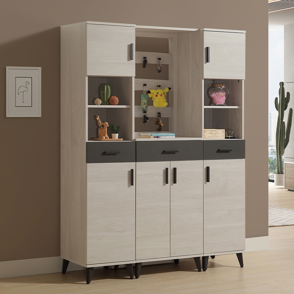 收納功能:頂層與底層的雙門櫃結構,不僅能完美隱藏日常雜物,底層門櫃內配置多層隔板還可依鞋履或物品高度靈活調整;中間開放式空間,方便隨手拿取耳機或書籍,搭配抽屜收納零碎小物,讓居家收納在保持隱私的同時,也兼具隨取隨用的便利性。