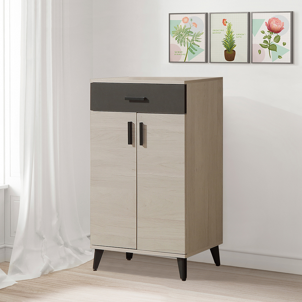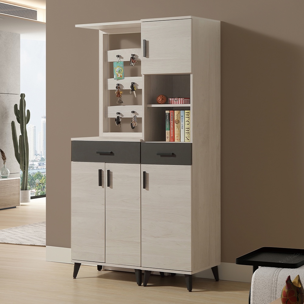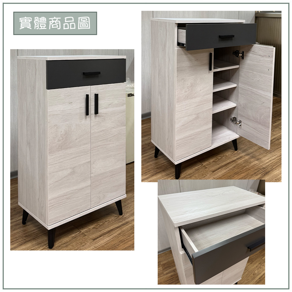 收納功能:上方配備一個寬抽屜,方便收納鑰匙、錢包、口罩等日常出門小物;下方雙開門空間內含三層活動隔板,可自由調整高度,無論平底鞋、高筒靴或居家雜物,都能整齊歸位,讓空間保持井然有序。