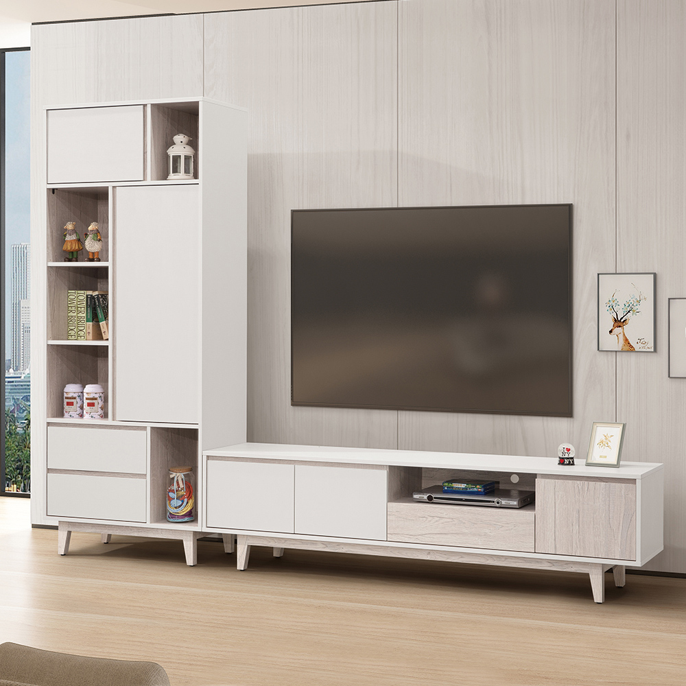 收納功能:展示櫃結合開放式層格、防塵門櫃與雙抽屜,讓展示與儲物各得其所;電視櫃則聚焦於視聽機能,中央開放層架與抽屜能俐落收納影音設備、遙控器與光碟,兩側門櫃則能擴充儲物量並隱藏雜物。靈活的機能分區,能滿足多元的儲物需求。