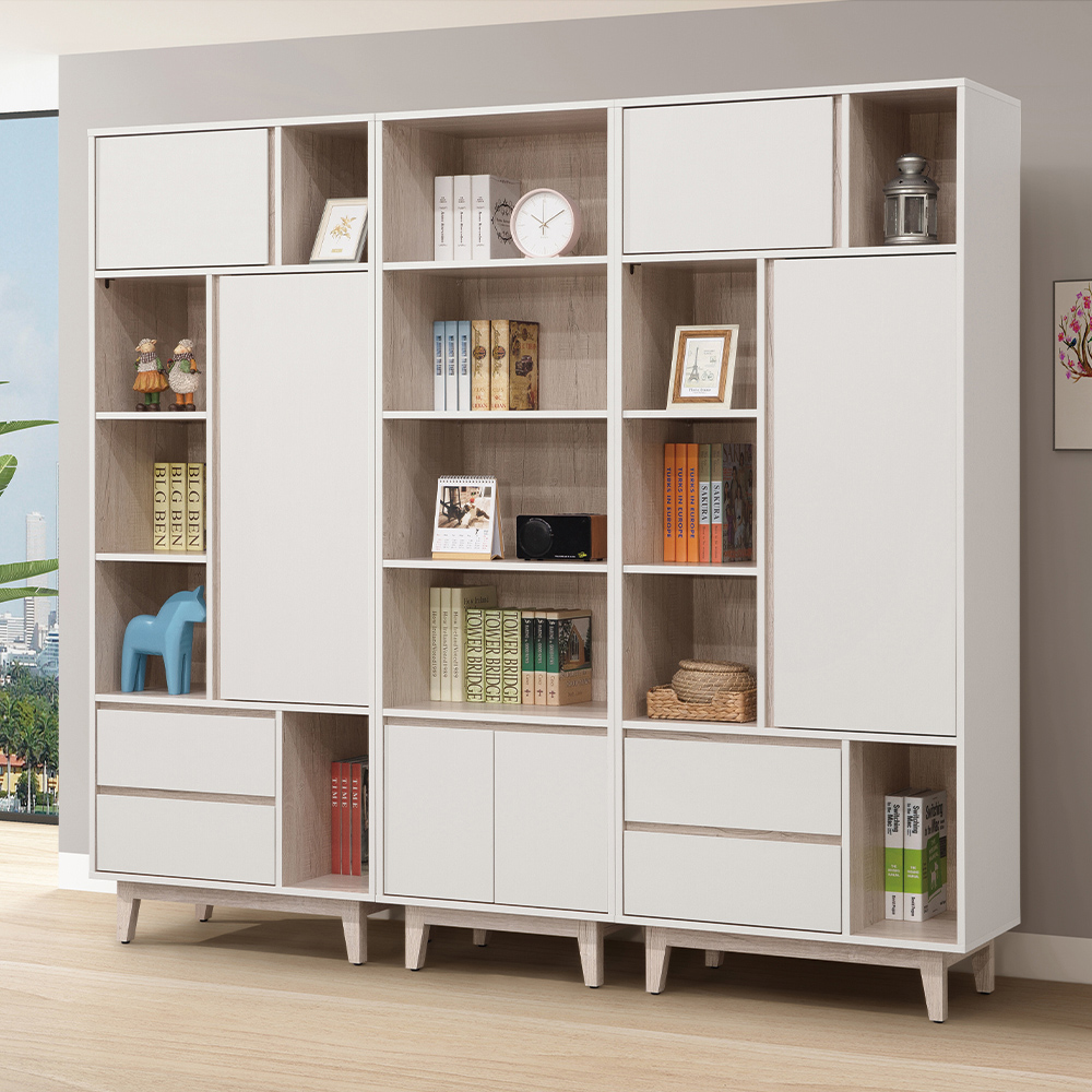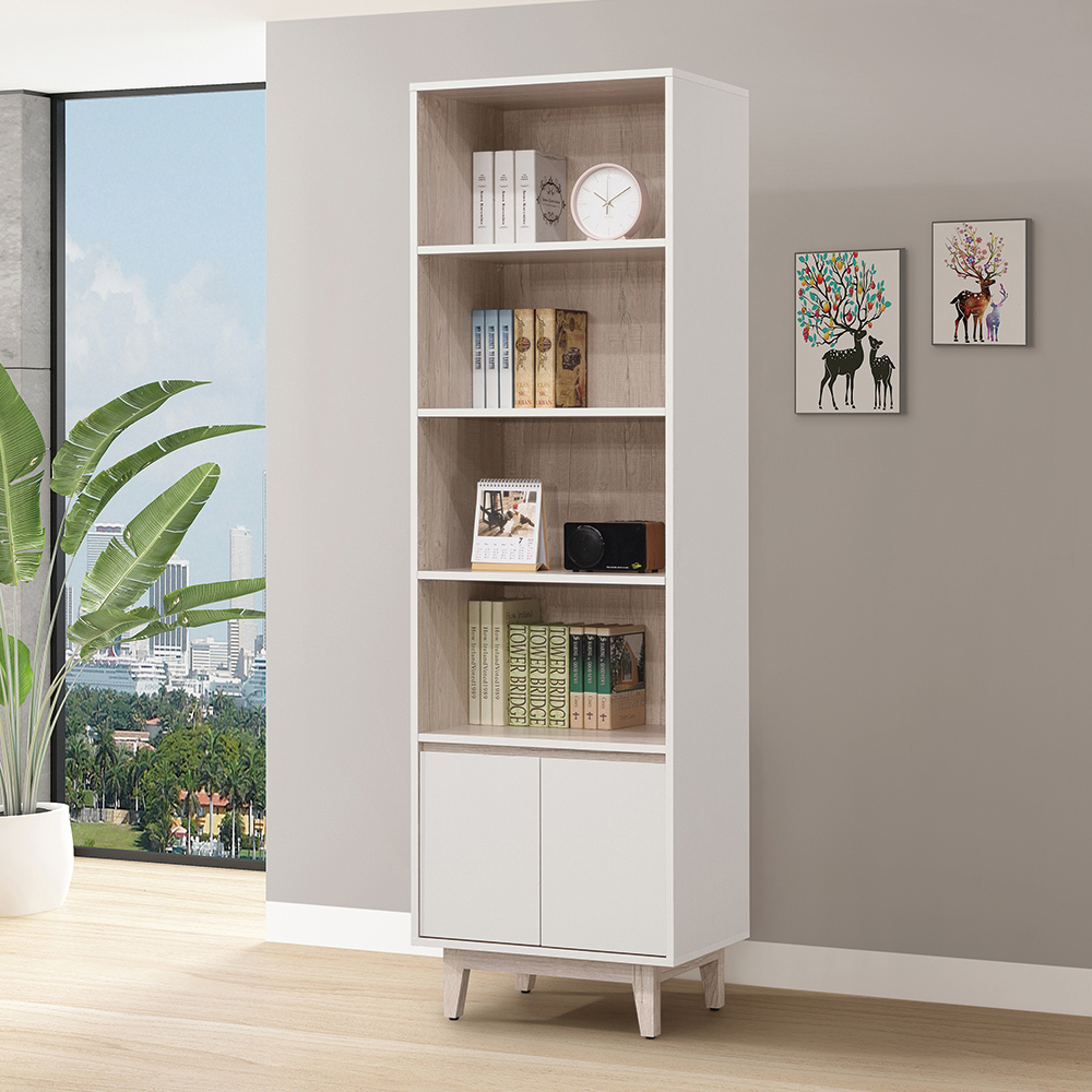 收納功能:四層開放式層格提供展示與取用空間,無論是日常閱讀的書籍、鬧鐘與文具都能一目瞭然;底部雙門櫃則能收納高大活頁夾、重要文件或各式雜物,能滿足多元的儲物需求。