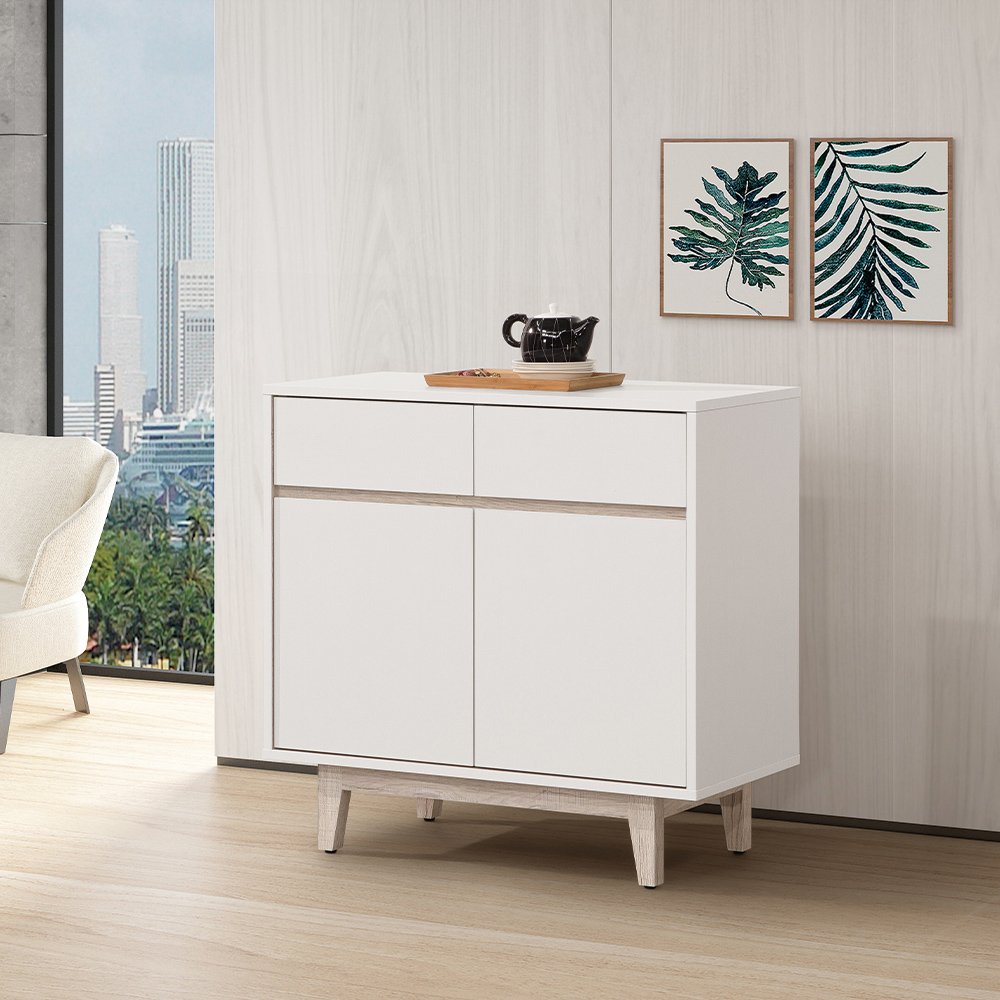 收納功能:平整的檯面是專屬咖啡角或備餐區;雙抽屜可以歸類餐具與瑣碎小物,拿取順手;下方雙門櫃內部搭配層板,可靈活運用於擺放碗盤、乾貨或小型廚房電器。隱藏式收納將繁雜隱於無形,給餐廳最純粹的清爽視覺。
