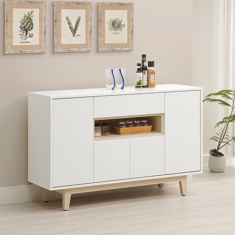 收納功能:抽屜適合存放餐具與零散小物;門櫃內部設有靈活隔板,能妥善隱藏各式碗盤、罐頭或茶包;中間的開放式層隔則提供了展示常用器皿或裝飾品的空間,讓收納不再單調,既實用又兼具視覺美感。