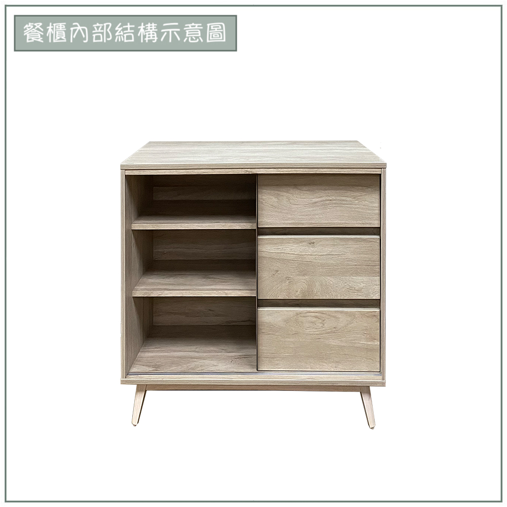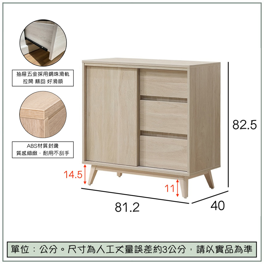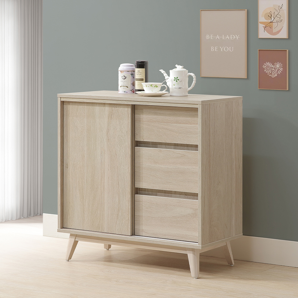 收納功能:左側滑門內配置可調式活動隔板,可依物品高度彈性調整空間,輕鬆收納大型器皿或書籍;右側三層獨立抽屜,日常零碎小物可分類收納,兼具隱藏收納與取用便利性,讓收納更有條理。