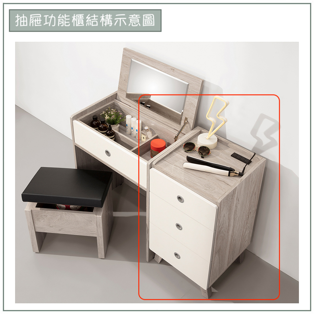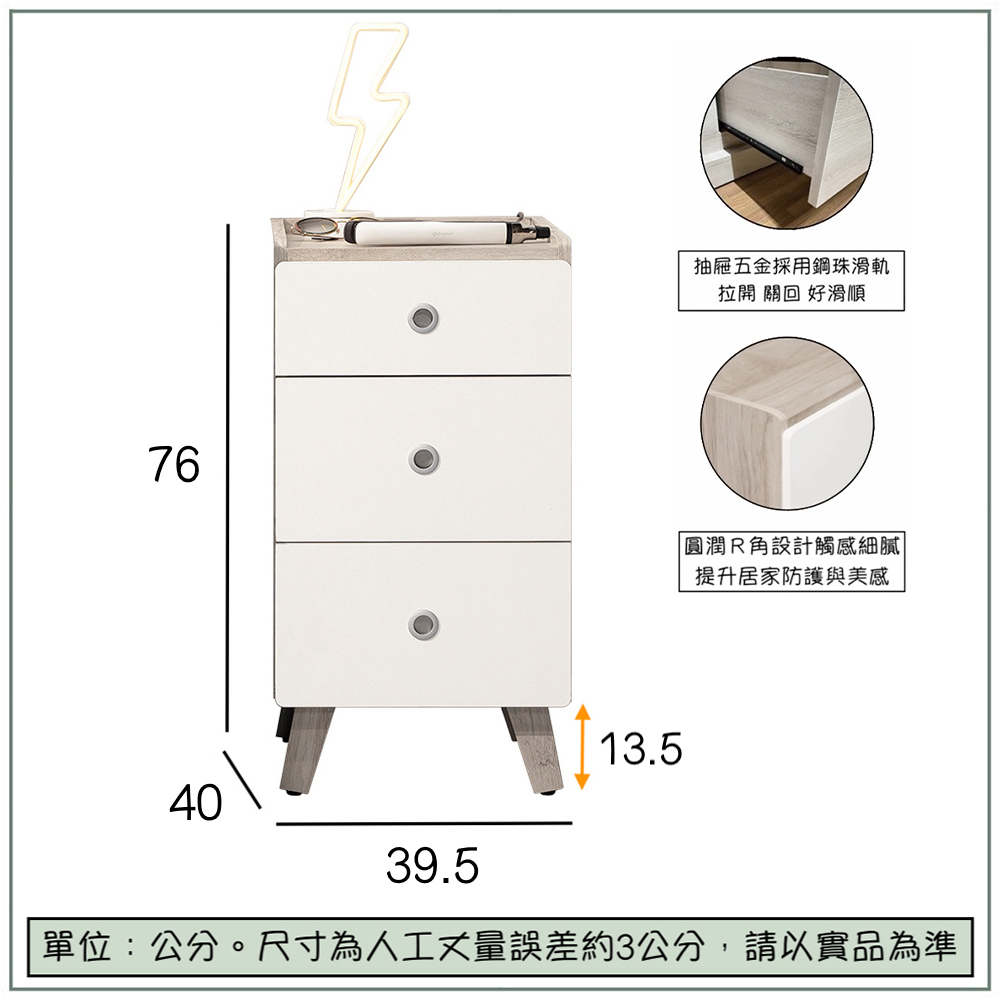 收納功能:三層抽屜式設計,提供充足且清楚分類的收納空間;檯面內建電源插座,讓手機、平板或香氛燈可於床邊直接充電,免去彎腰找插頭的不便。搭配防落邊緣設計,可安心放置手機、眼鏡與燈具,瞬間成為整潔有序的充電平台,提升日常生活效率。