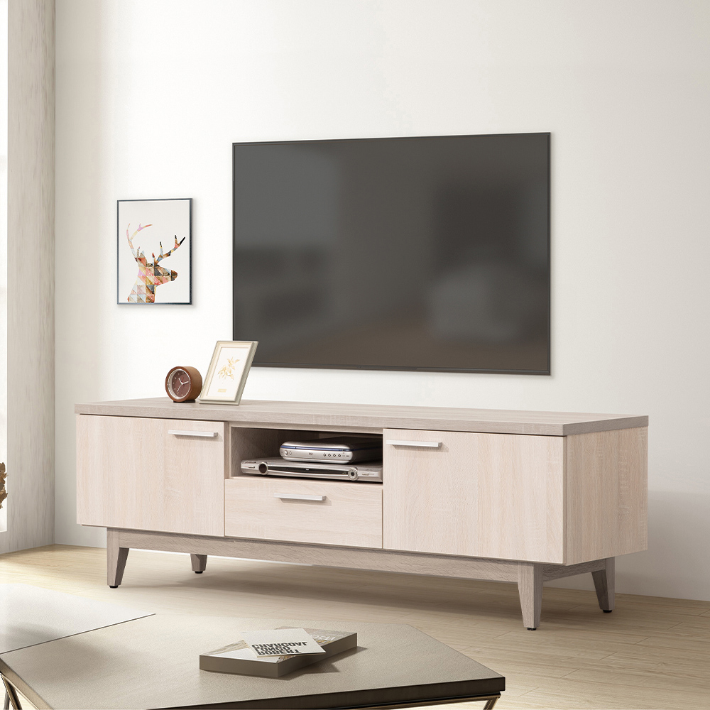 收納功能:中央設有專屬的影音設備層格,搭配後方電線孔,完美隱藏凌亂線材;下方的抽屜可收納零散小物或遙控器;兩側門櫃適合隱藏雜亂的書籍、電線或生活備品,讓收納不再只是堆疊,更是一種生活的陳列。