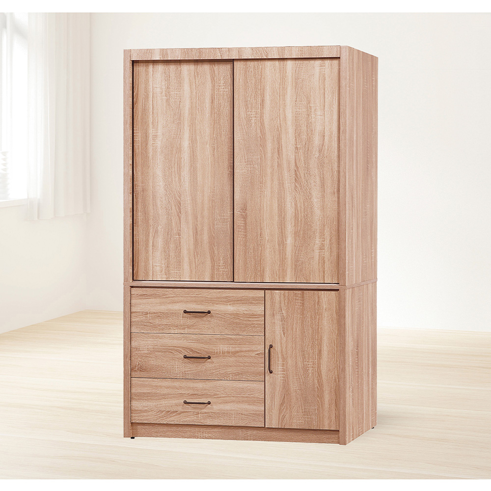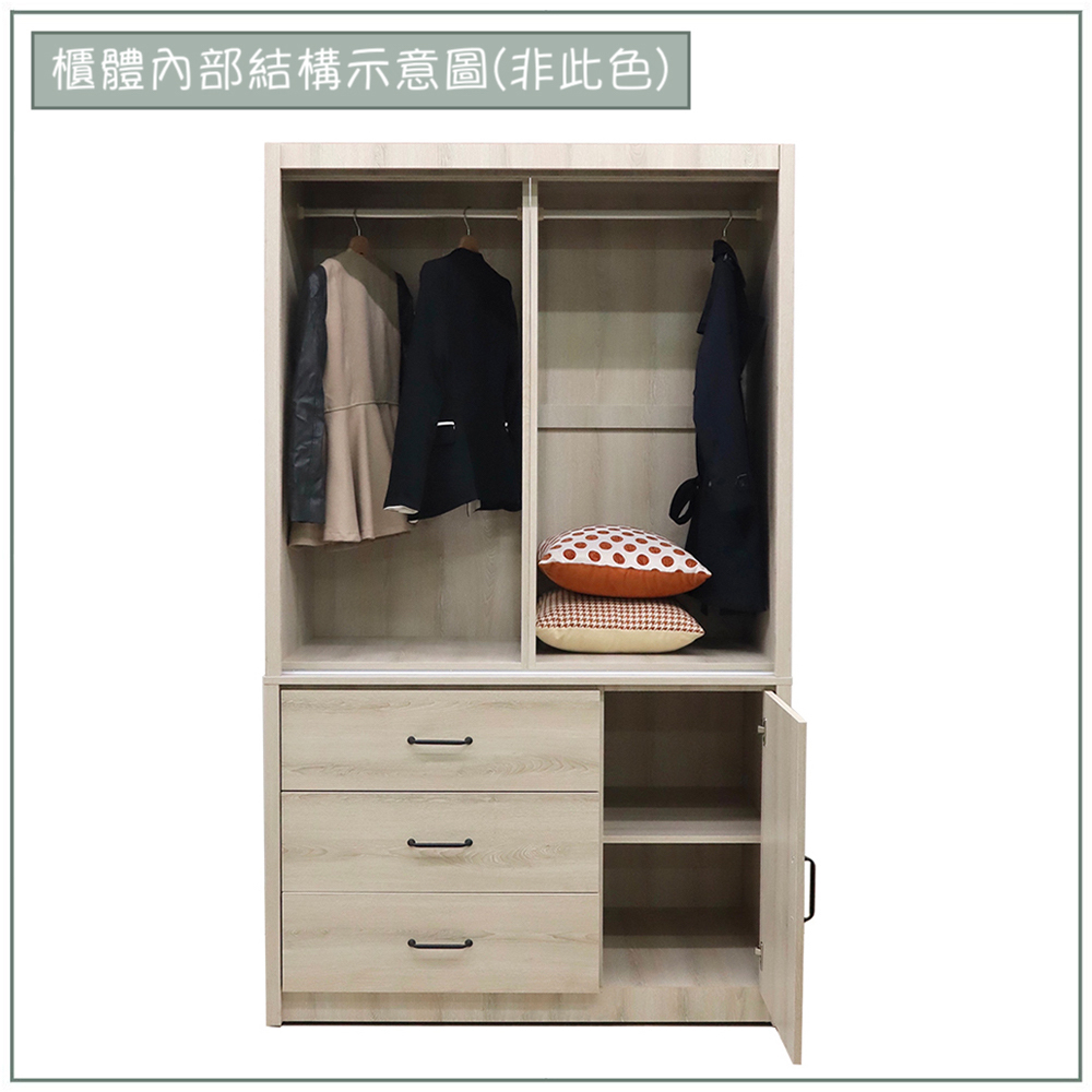 多樣化收納:上層吊衣區可以掛襯衫、洋裝、外套等,維持衣物平整;下方抽屜櫃適合收納折疊的衣物或配件;左側櫃門可以擺放行李箱、鞋子等私人物品,滿足各種收納分類需求。