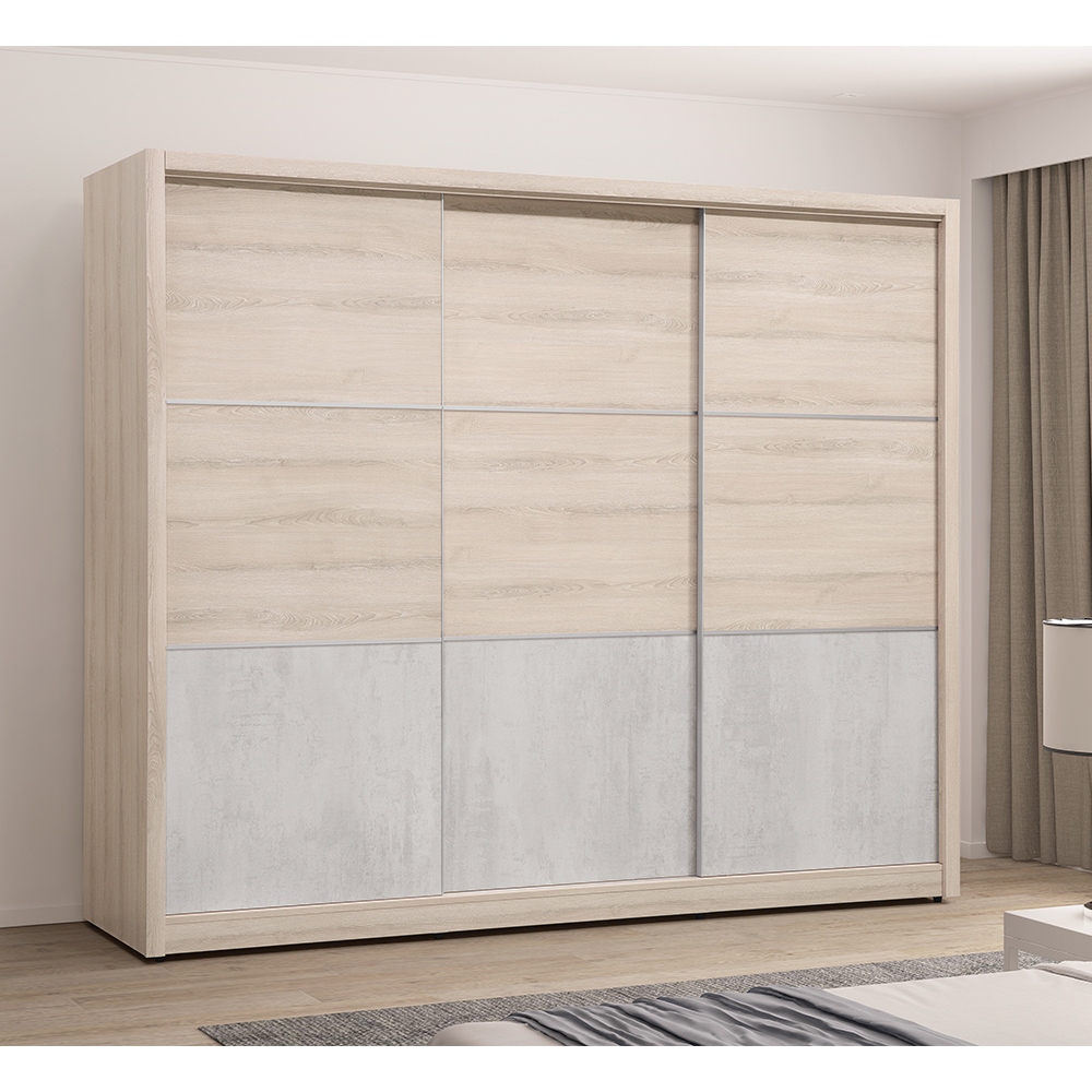 衣櫃設計:以溫潤的霧白橡木色為基調,搭配岩灰色美耐皿板點綴,形成多層次的視覺感。三門滑門開合順暢,收納更靈活,衣物、大型寢具或行李箱都能有條不絮的安放。