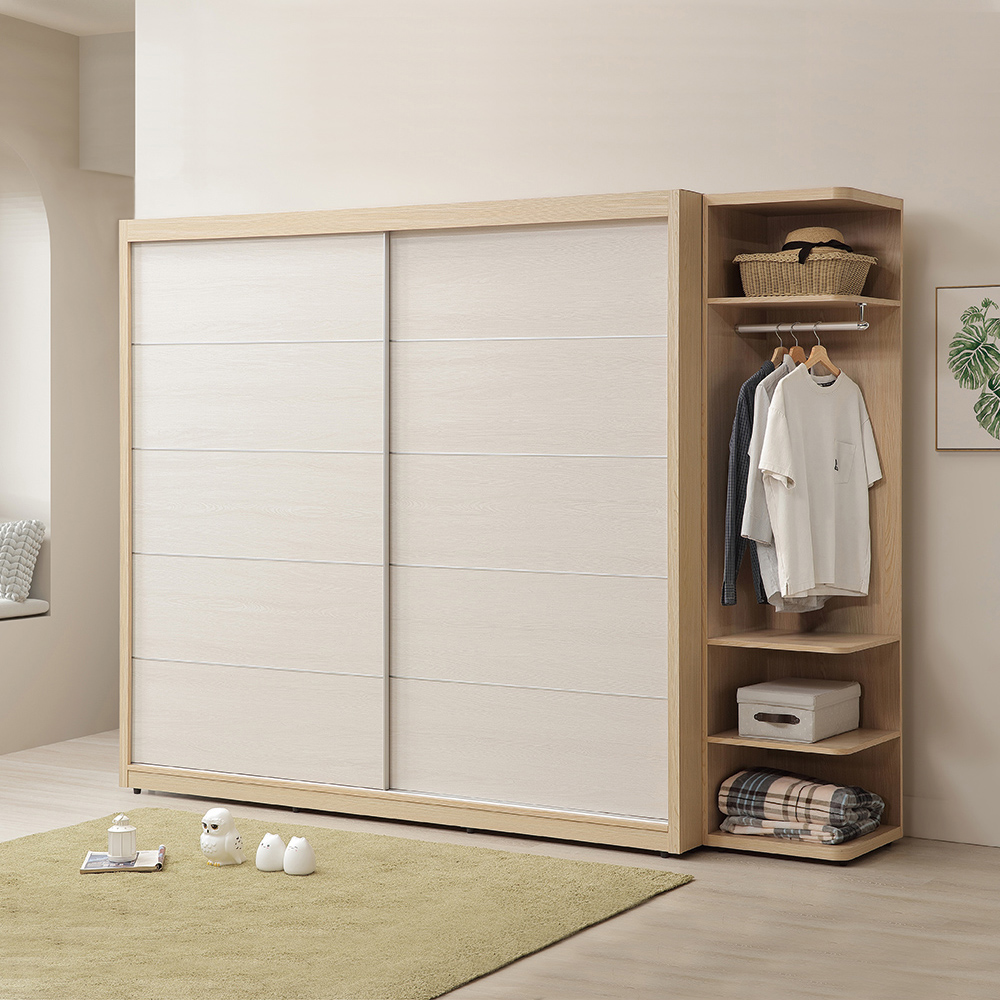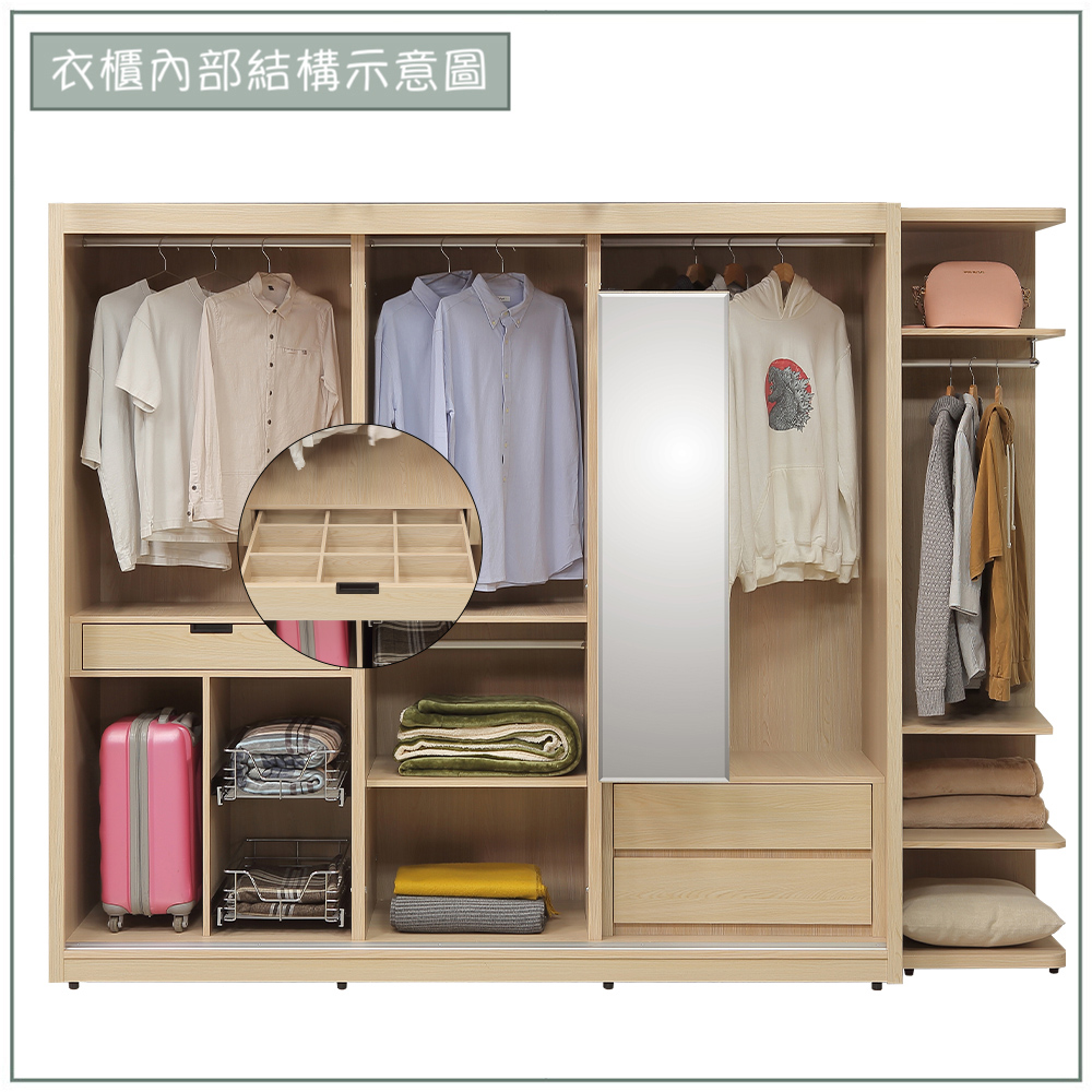 收納功能:內部設置長短衣分層的雙掛衣區與專屬行李箱置物空間;中間分格抽屜可分類小物,下層金屬滑籃透氣耐用、可整籃拉出;雙層抽屜能收厚衣或需要折疊的衣物。開放式轉角櫃,可以放置包包與常用物件隨手好放,整體收納清楚又實用。