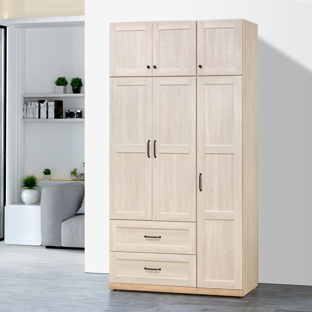 收納功能:頂部設有大容量被櫥櫃,適合放置季末棉被或旅行箱;吊衣桿空間,讓大衣、洋裝能平整懸掛不產生皺褶;下方雙抽屜設計方便分類收納私密衣物或配件;側邊多層層格,能靈活置放折疊衣物或包包,內部空間規劃滿足多元化的收納需求。