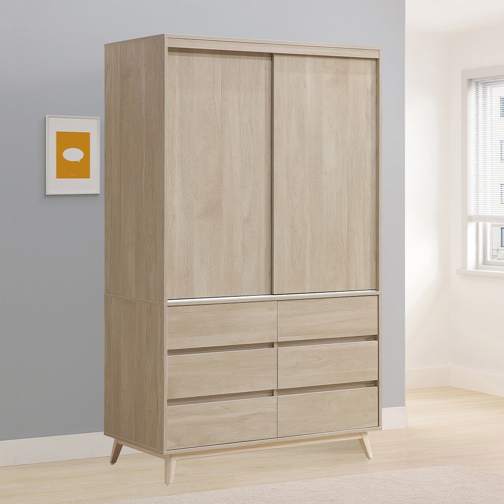 收納功能::上層以雙推門設計搭配左右獨立吊衣桿,能分區吊掛襯衫與大衣,衣物不易皺折、保持整齊;下方配置六格大容量抽屜,貼身衣物、圍巾與居家織品皆可分類清楚、取用便利,讓收納更有條理。