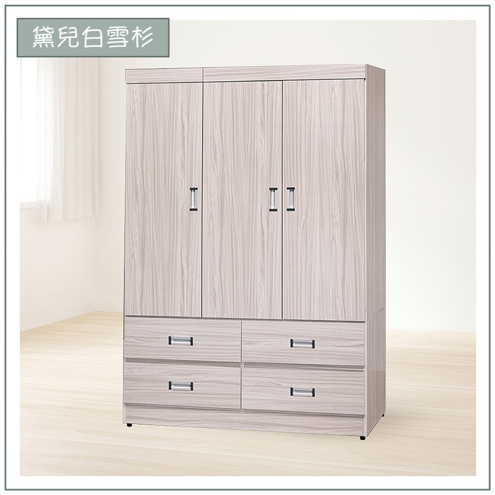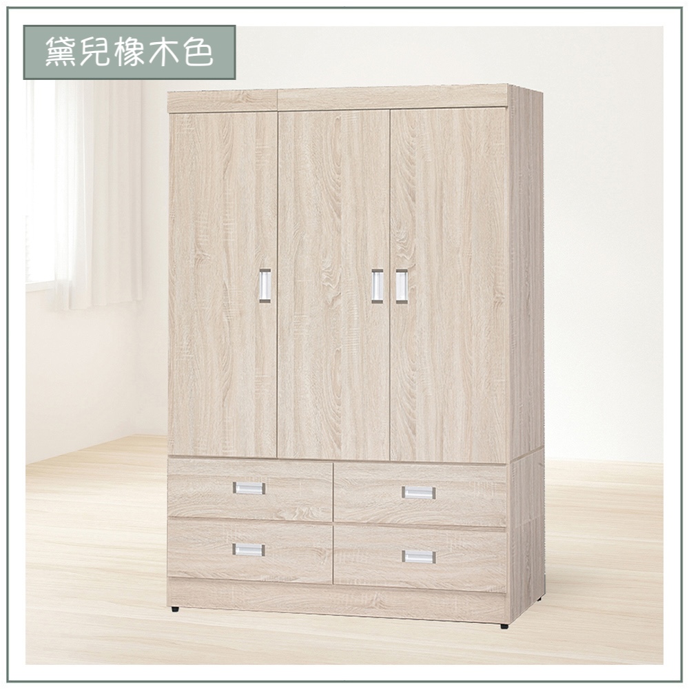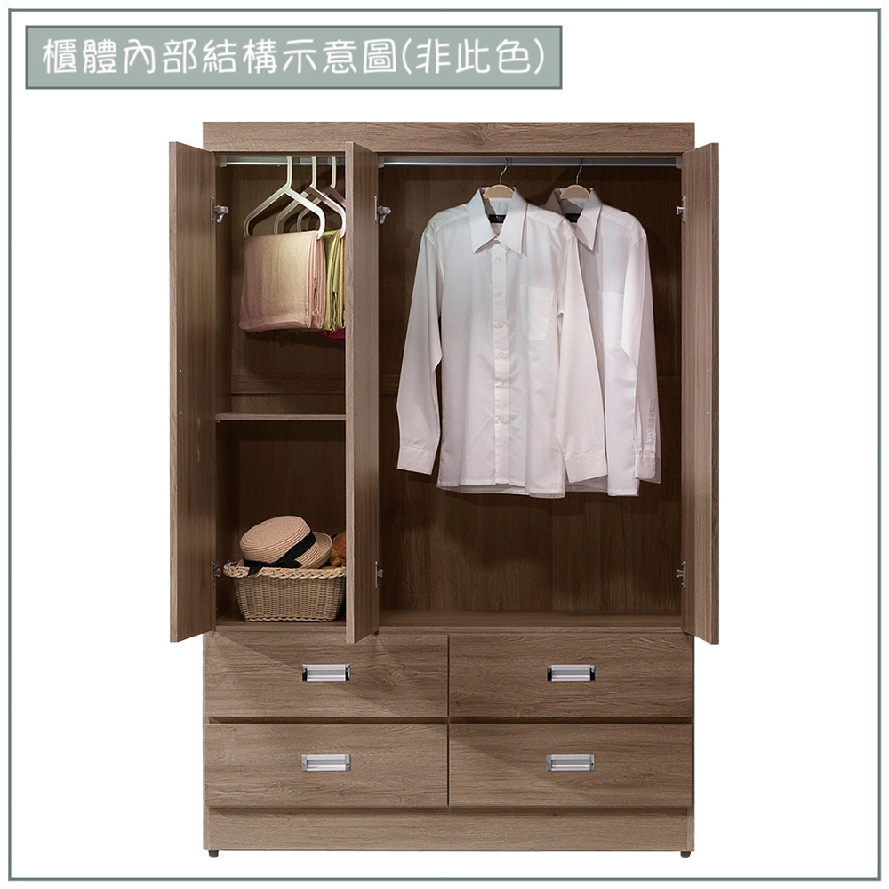 收納功能:以三門空間劃分,右側內部配置穩固掛衣桿,適合吊掛襯衫、大衣等易皺衣物;左側則規劃可拆式吊衣桿與活動層板,無論是摺疊衣物、包包或收納盒,都能依需求自由調整。下方設有四格抽屜,方便分類收納貼身衣物、配件與換季衣物,讓日常整理更有條理。