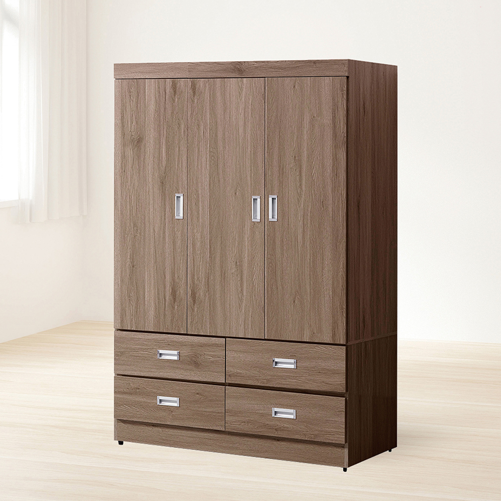 收納功能:以三門空間劃分,右側內部配置穩固掛衣桿,適合吊掛襯衫、大衣等易皺衣物;左側則規劃可拆式吊衣桿與活動層板,無論是摺疊衣物、包包或收納盒,都能依需求自由調整。下方設有四格抽屜,方便分類收納貼身衣物、配件與換季衣物,讓日常整理更有條理。