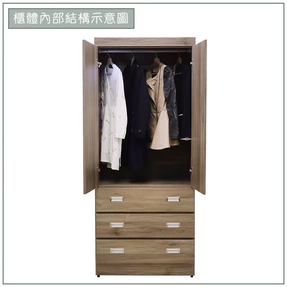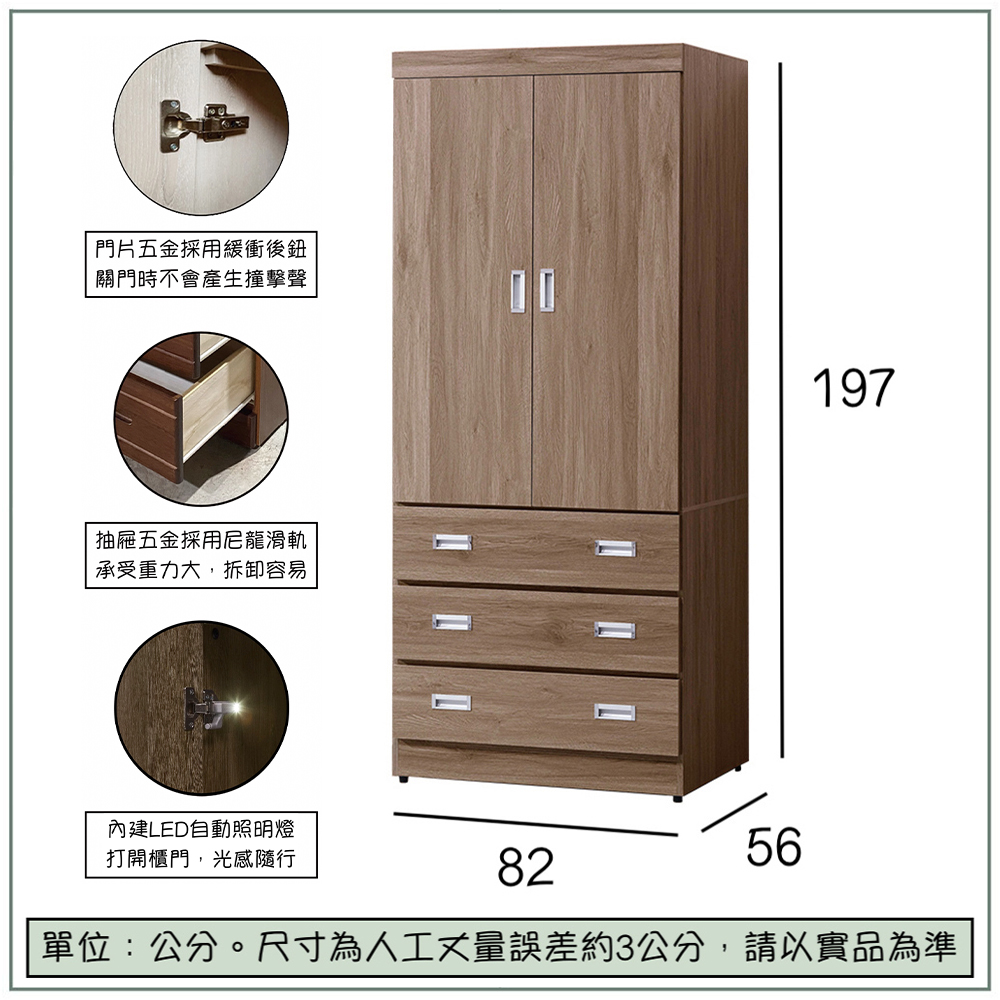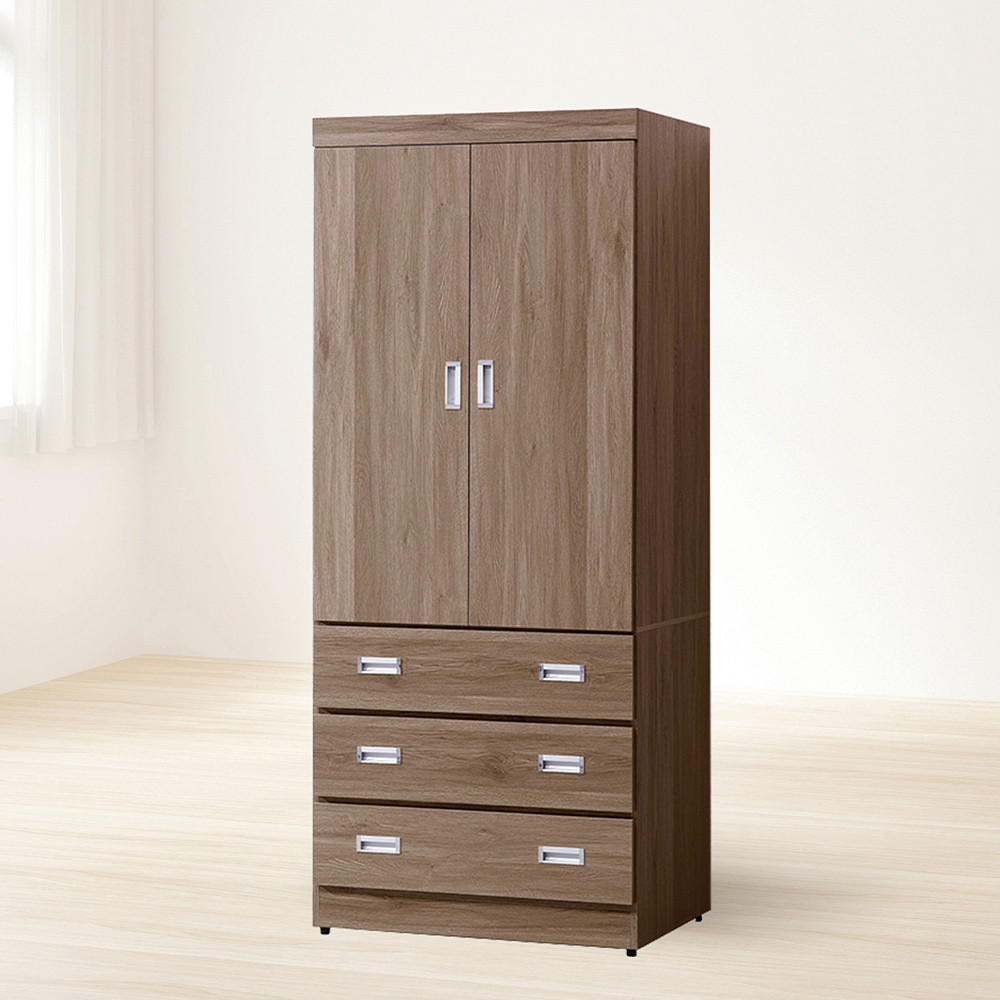 收納功能:上方雙開門空間寬敞,適合懸掛大衣、襯衫或長裙,有效防止衣物皺褶;下方配置三層抽屜,方便分類收納摺疊衣物、貼身配件或日常雜物,讓空間運用更加靈活,滿足全方位的儲物需求。