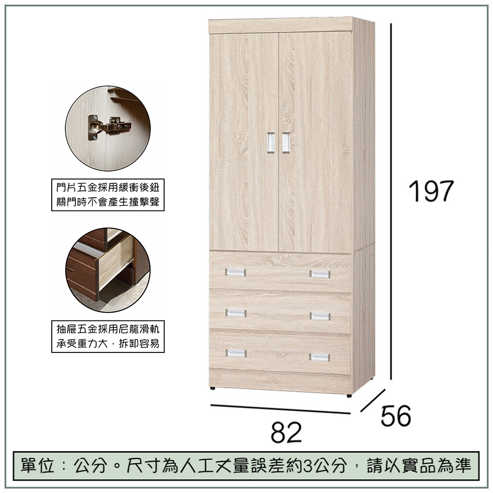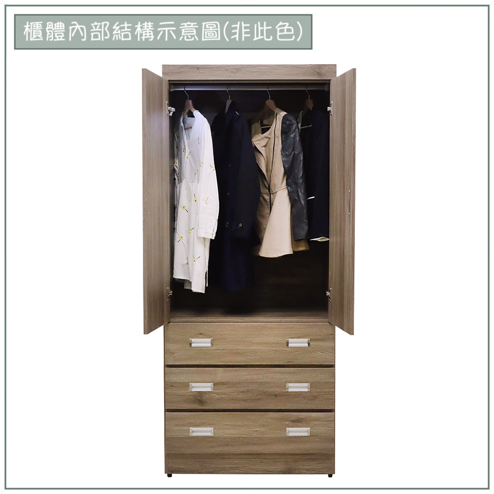 收納功能:上方雙開門空間寬敞,適合懸掛大衣、襯衫或長裙,有效防止衣物皺褶;下方配置三層抽屜,方便分類收納摺疊衣物、貼身配件或日常雜物,讓空間運用更加靈活,滿足全方位的儲物需求。