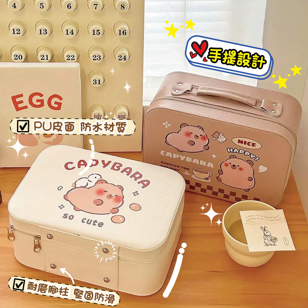 不只人要可愛,收納箱也要很可愛!既可愛又實用的收納箱,萌萌的卡皮巴拉圖案設計,讓你外出都有好心情~便攜的手提設計,方便你隨時攜帶,無論上學還是旅行都能輕鬆攜帶!讓你輕鬆整理文具、玩具、化妝品等…物品,可當化妝箱、飾品箱、小玩具箱、小朋友最愛的咕卡收納箱都可以~~~