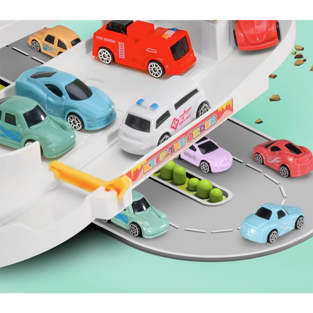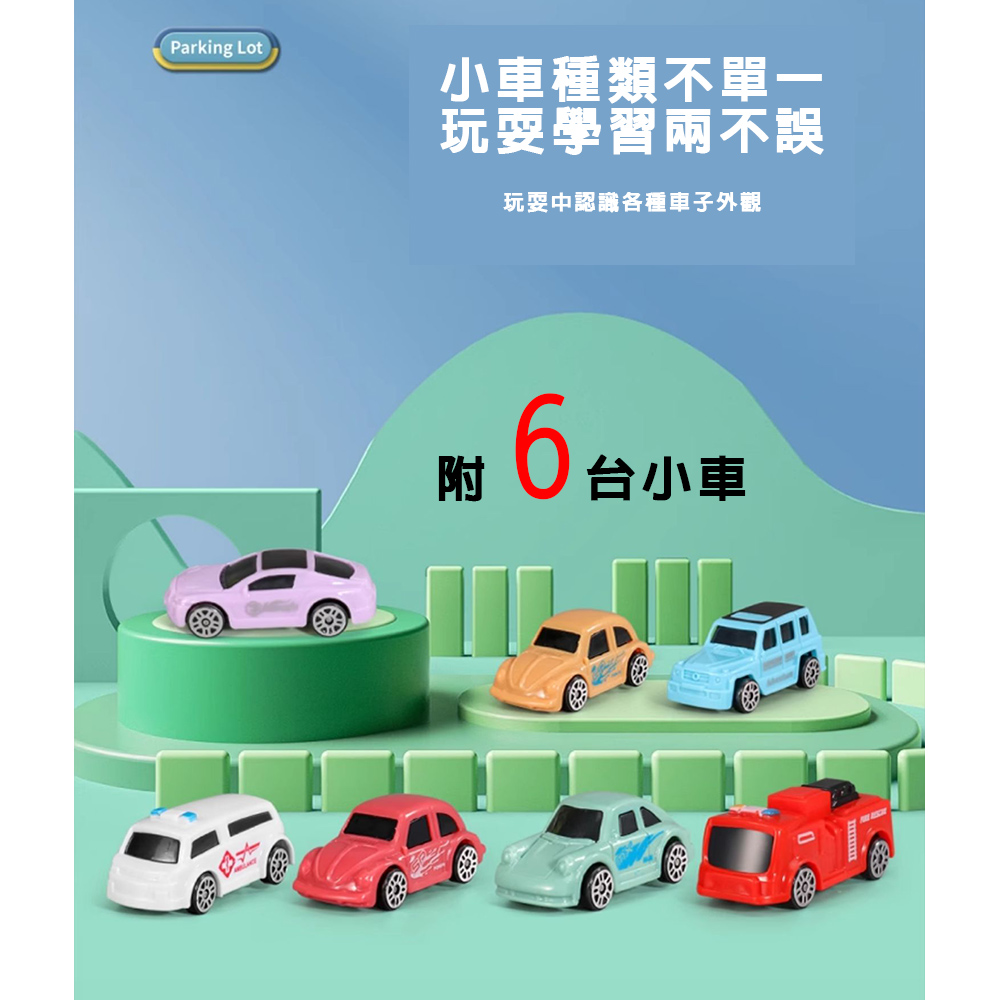 2.多層停車場設計:包括多個升降層,讓小車子在地面上和空中穿梭。可停放各種玩具車。