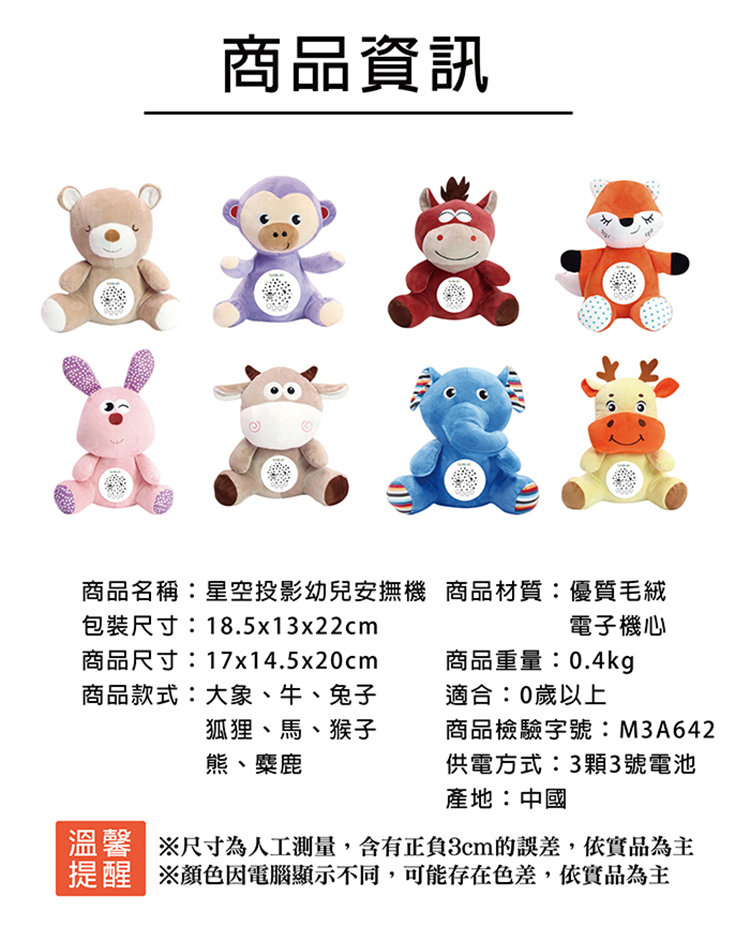 商品款式:大象、牛、兔子、狐狸、馬、猴子、熊、麋鹿