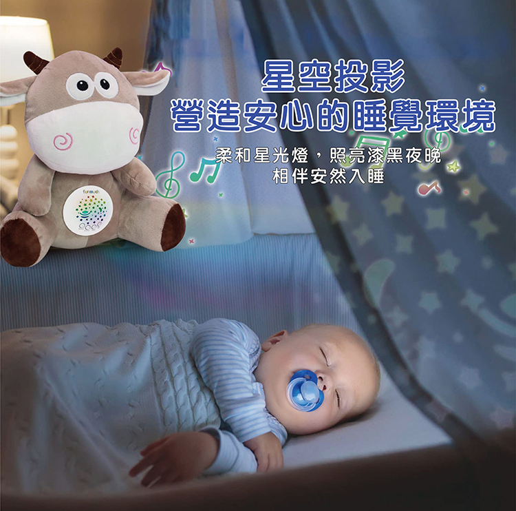 這款可愛的嬰兒安撫機具有舒緩的星光投射、平靜的聲音和輕柔的音樂,可幫助您的寶寶安定下來入睡。