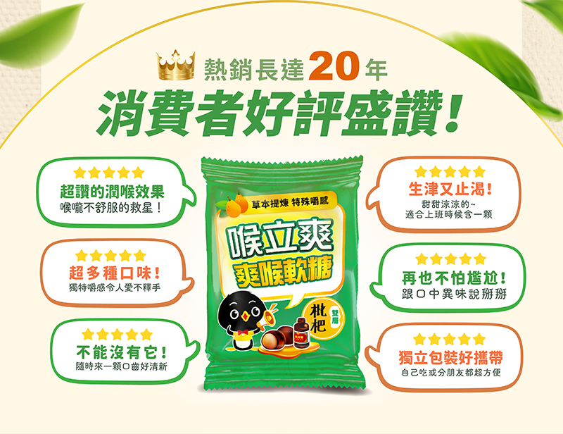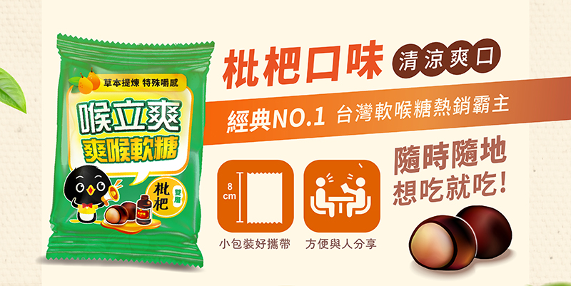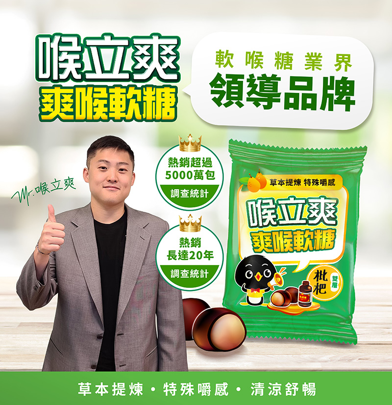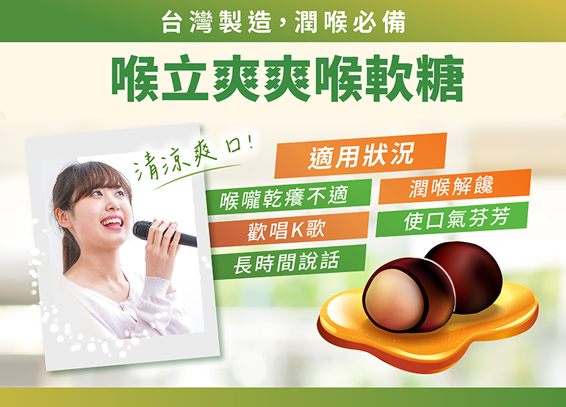 ◉喉立爽是針對忙碌的現代人所研發出口感特別的軟糖,特選數十種天然珍貴草本潤喉植物精煉,能快速達到爽聲潤喉的作用。無論是您唱歌、演講、抽菸、喝酒或喉嚨不適,隨時食用喉立爽,讓您喉嚨達到潤喉爽聲,清新舒暢。