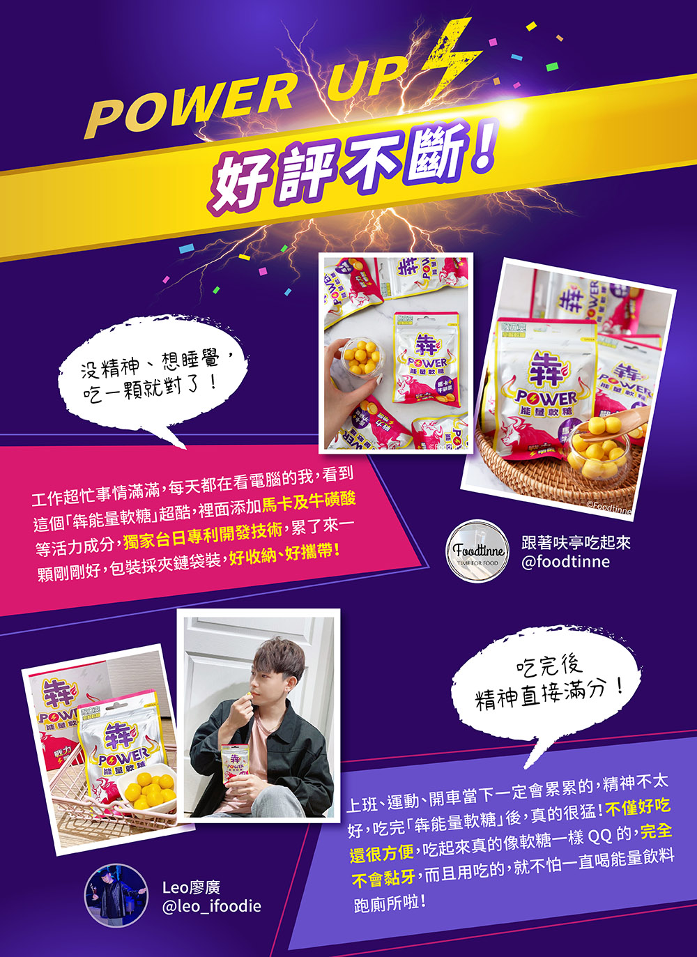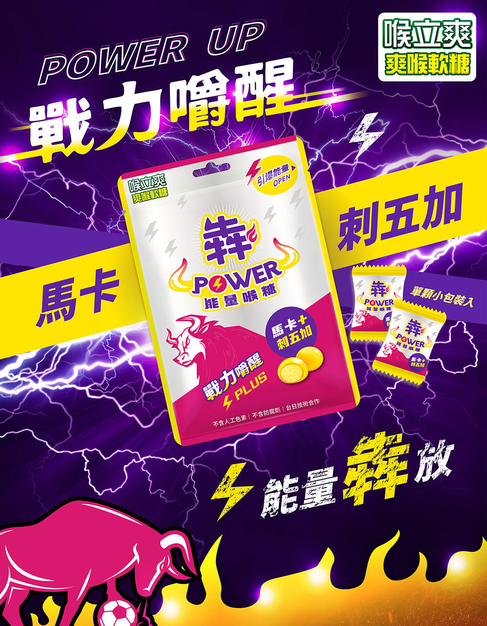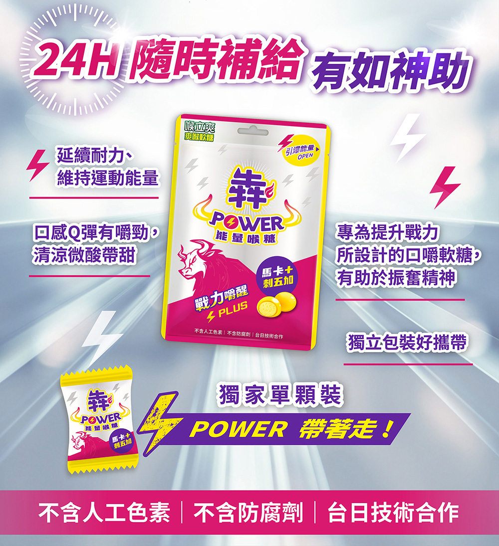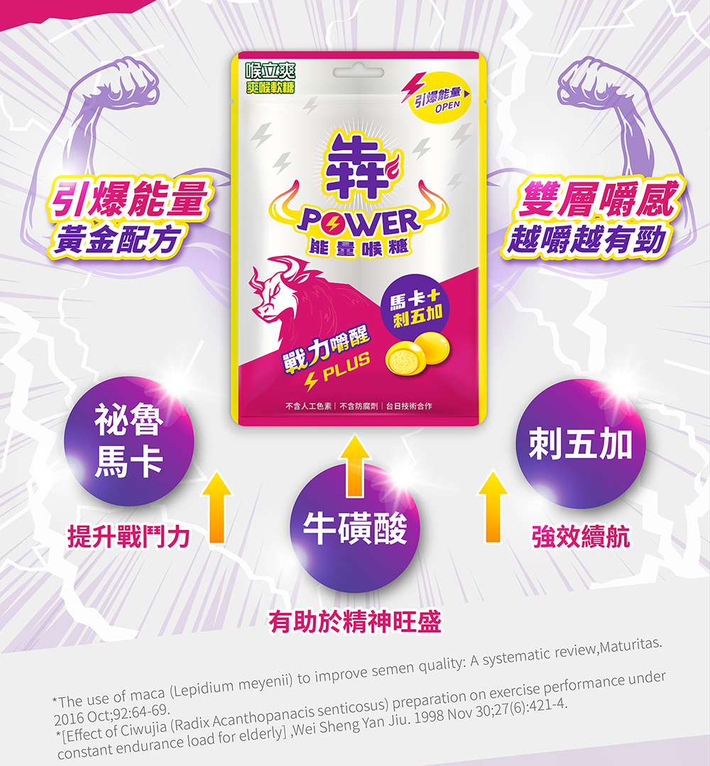 砂糖、麥芽糖、椰子油、明膠、檸檬酸(調味劑)、檸檬濃縮果汁、牛磺酸、綜合胺基酸(纈胺酸、異白胺酸、苯丙胺酸、白胺酸、離胺酸、蘇胺酸、色胺酸、精胺酸)、維生素C(抗氧化劑)、瓜拿那萃取物、香料、綜合維生素B群(菸鹼醯胺、維生素B6、維生素B1、維生素B2、維生素B12、麥芽糊精、本多酸鈣、重酒石酸膽鹼、乳酸)、五味子萃取物、馬卡萃取物、刺五加萃取物、天然食用色素(薑黃色素)、薄荷、棕櫚蠟(食品製造用劑)。