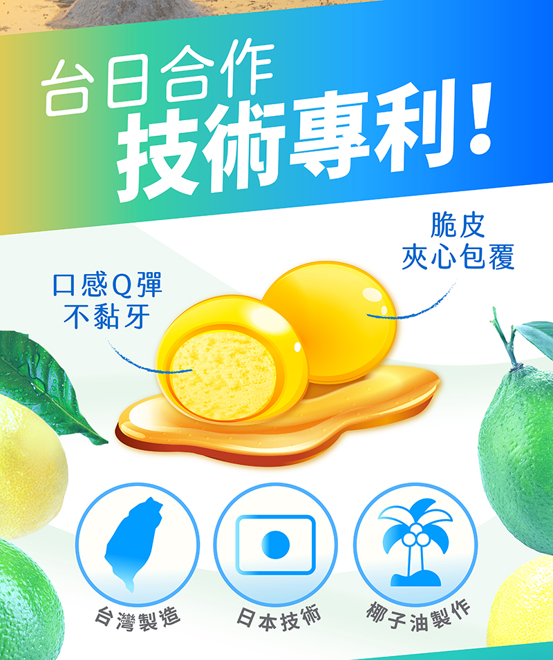砂糖、麥芽糖、椰子油、明膠、檸檬酸 (調味劑)、檸檬粉 (檸檬汁、麥芽糊精)、酸梅粉 (梅肉、食鹽)、蜂蜜、維生素C (抗氧化劑)、香料、天然食用色素 (薑黃色素)、海鹽、薄荷、棕櫚蠟 (食品製造用劑)。