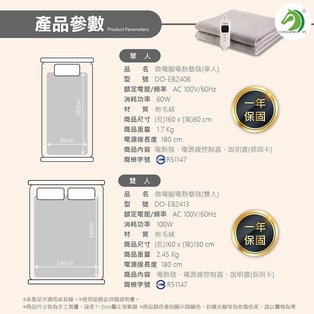 商品內容:電熱毯、電源線控制器、說明書(保固卡)